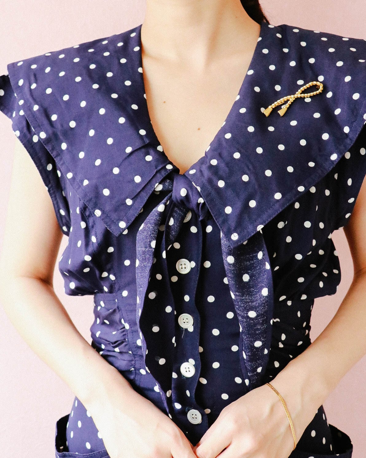 セーラー風の襟にリボン、キュッと締まるウエストはバックスタイルにこれまたリボン!