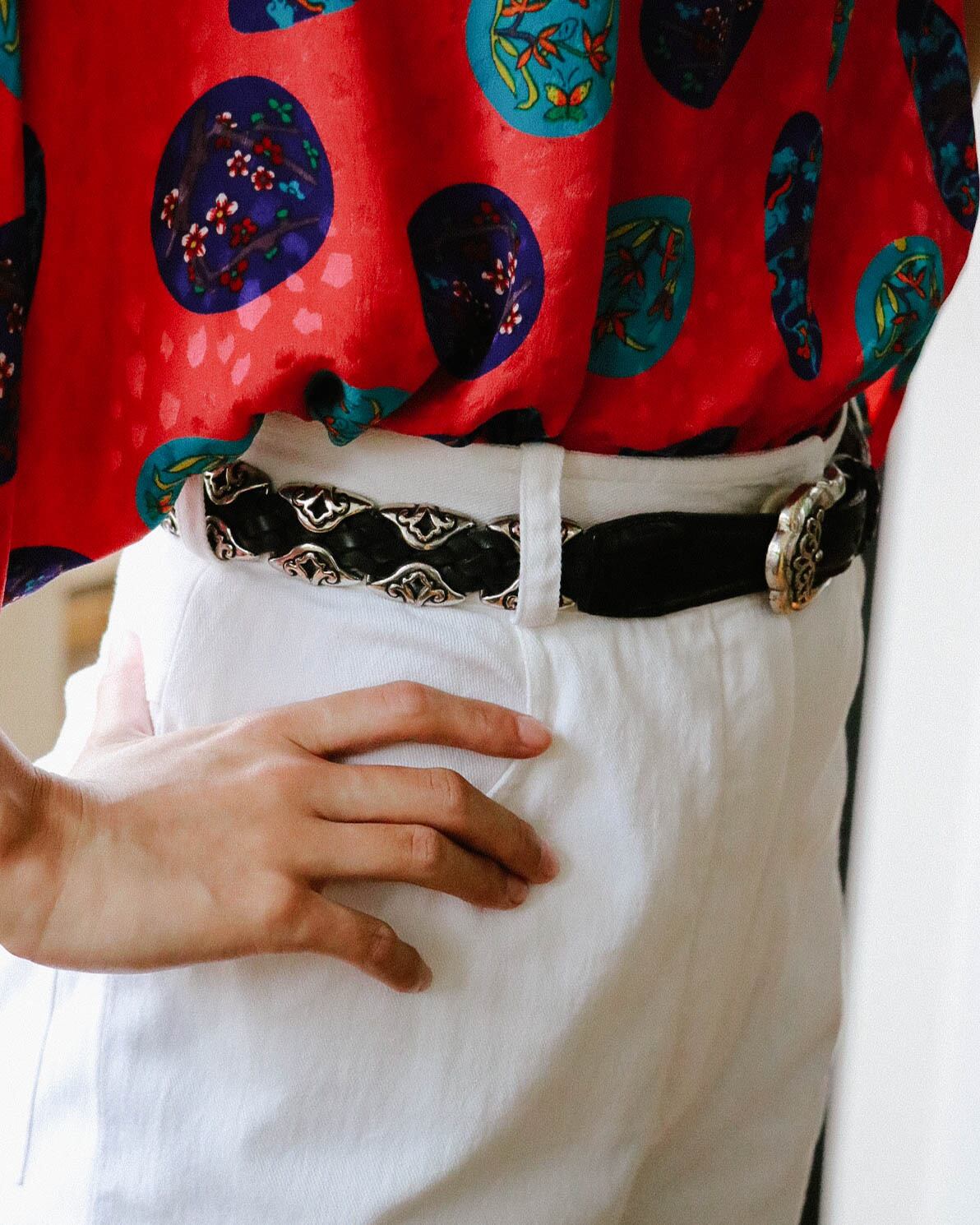 ブラックレザーはメッシュ部分と型押し部分で質感をかえているところもポイント。全体に施されたシルバーコンチョがコーディネートのスパイスに。レディなスタイリングの外しにも◎