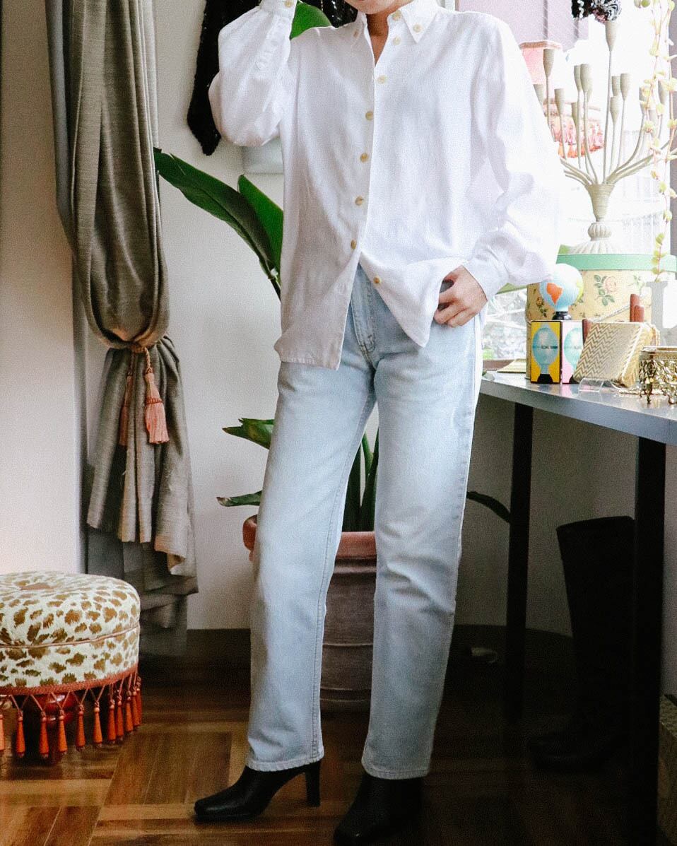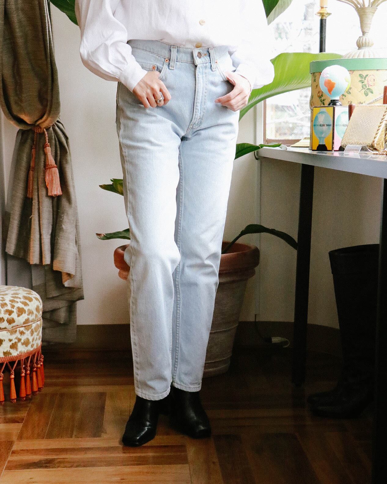 リーバイス510デニムパンツ。ジッパーフライのジーンズで、深めのウエストはタックインも綺麗に決まる。スタンダードなストレートシルエットにライトブルーでトレンド関係なくずっと楽しめます。