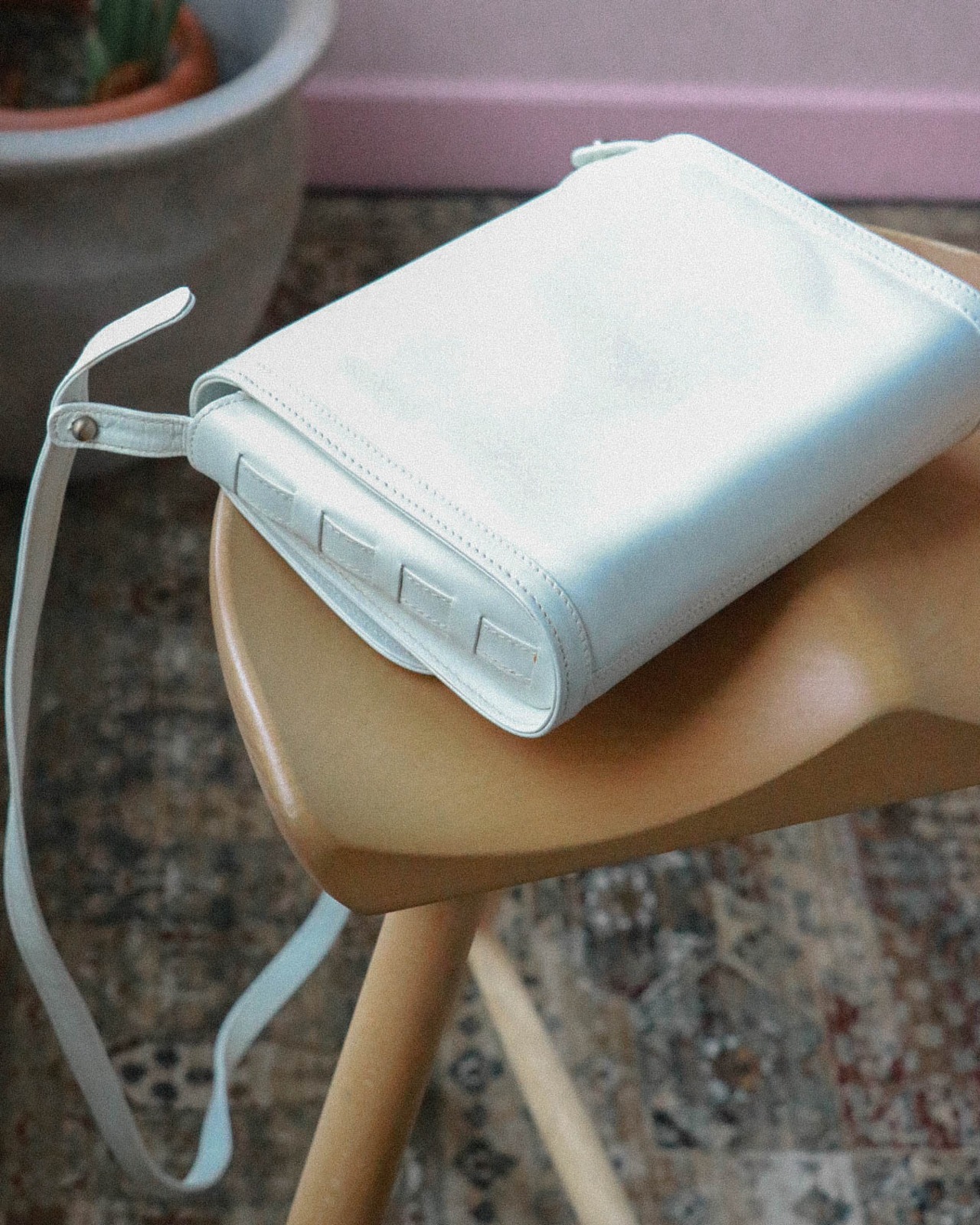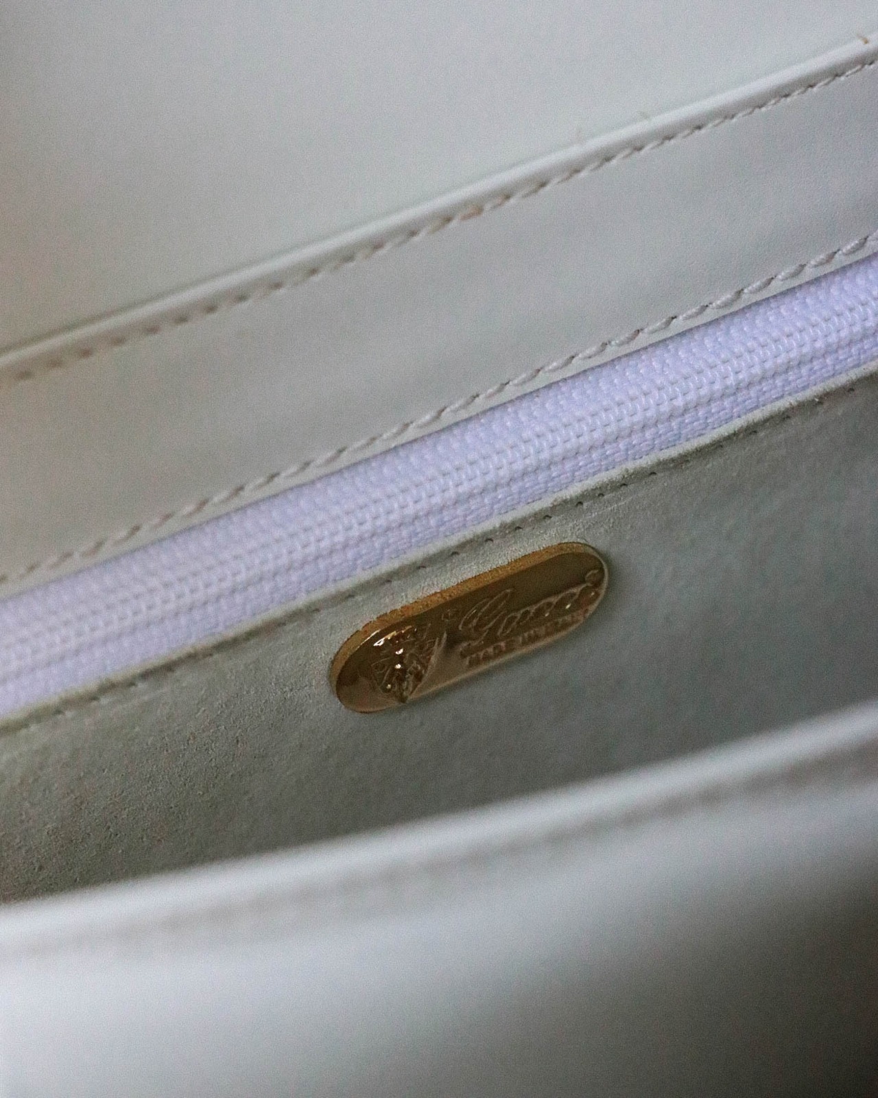 夏めくホワイトレザーのシンプルバッグ。サイドの編み込みデザインがアクセントをきかせたグッチらしい一点。