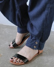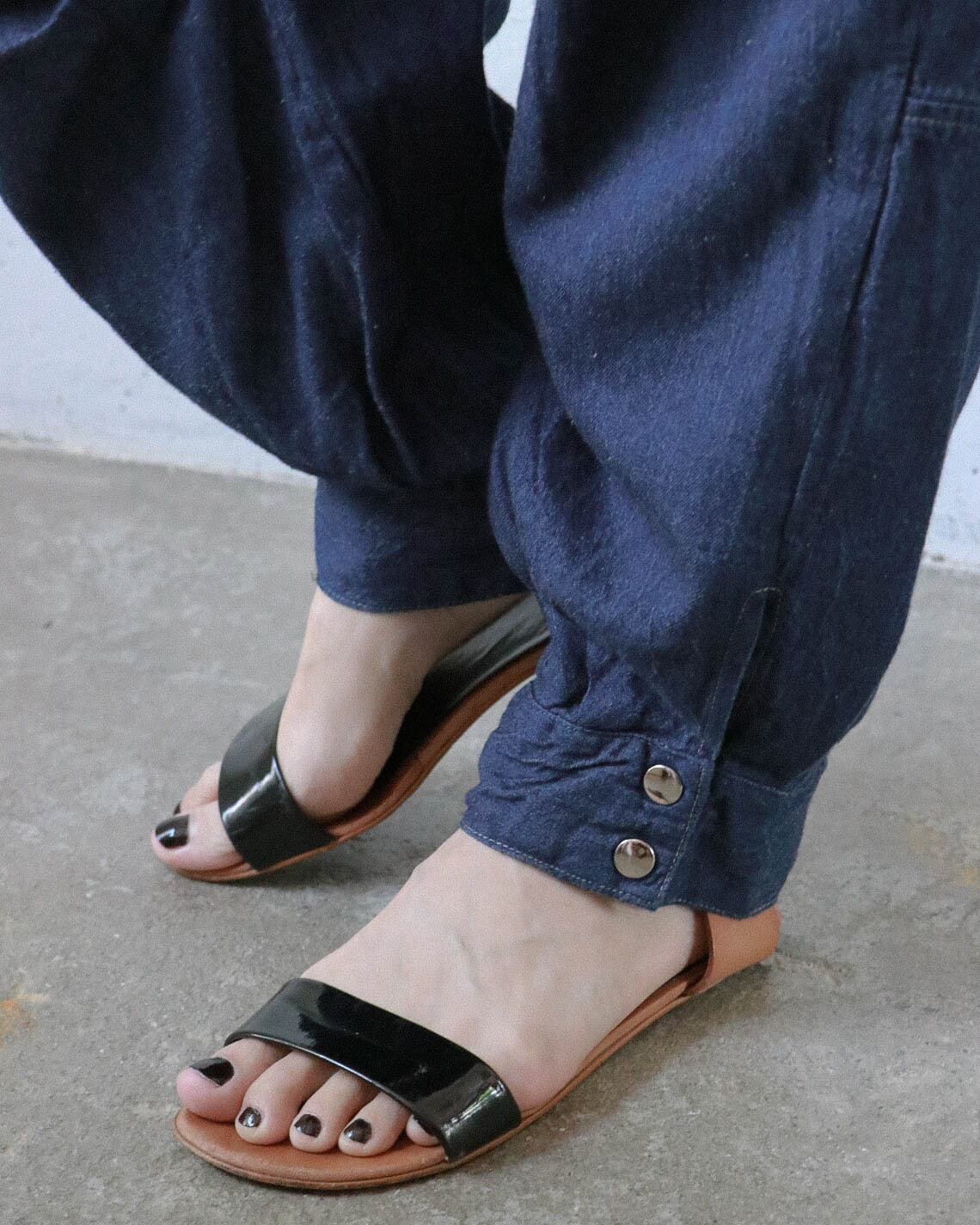膝周りにはステッチとタックが施されているので足捌きも良く快適。裾にシルバーのスナップボタンが付いて、より特徴的なシルエットに。