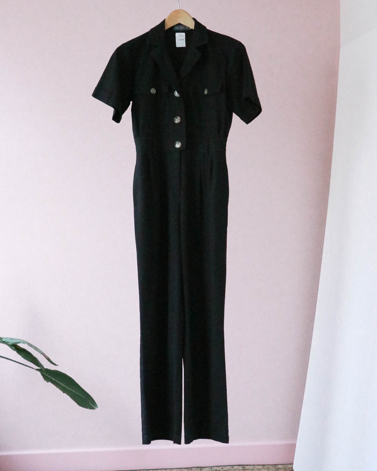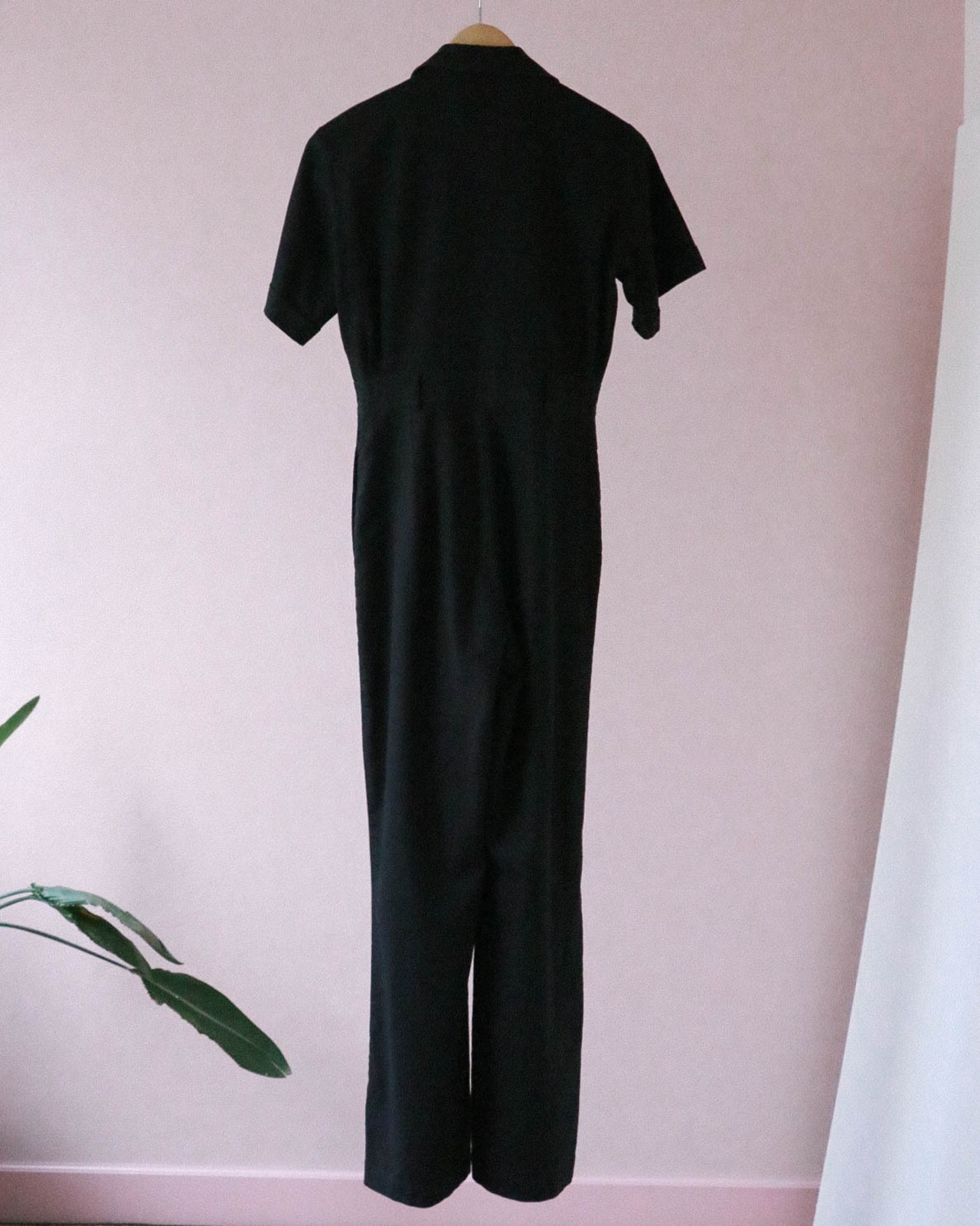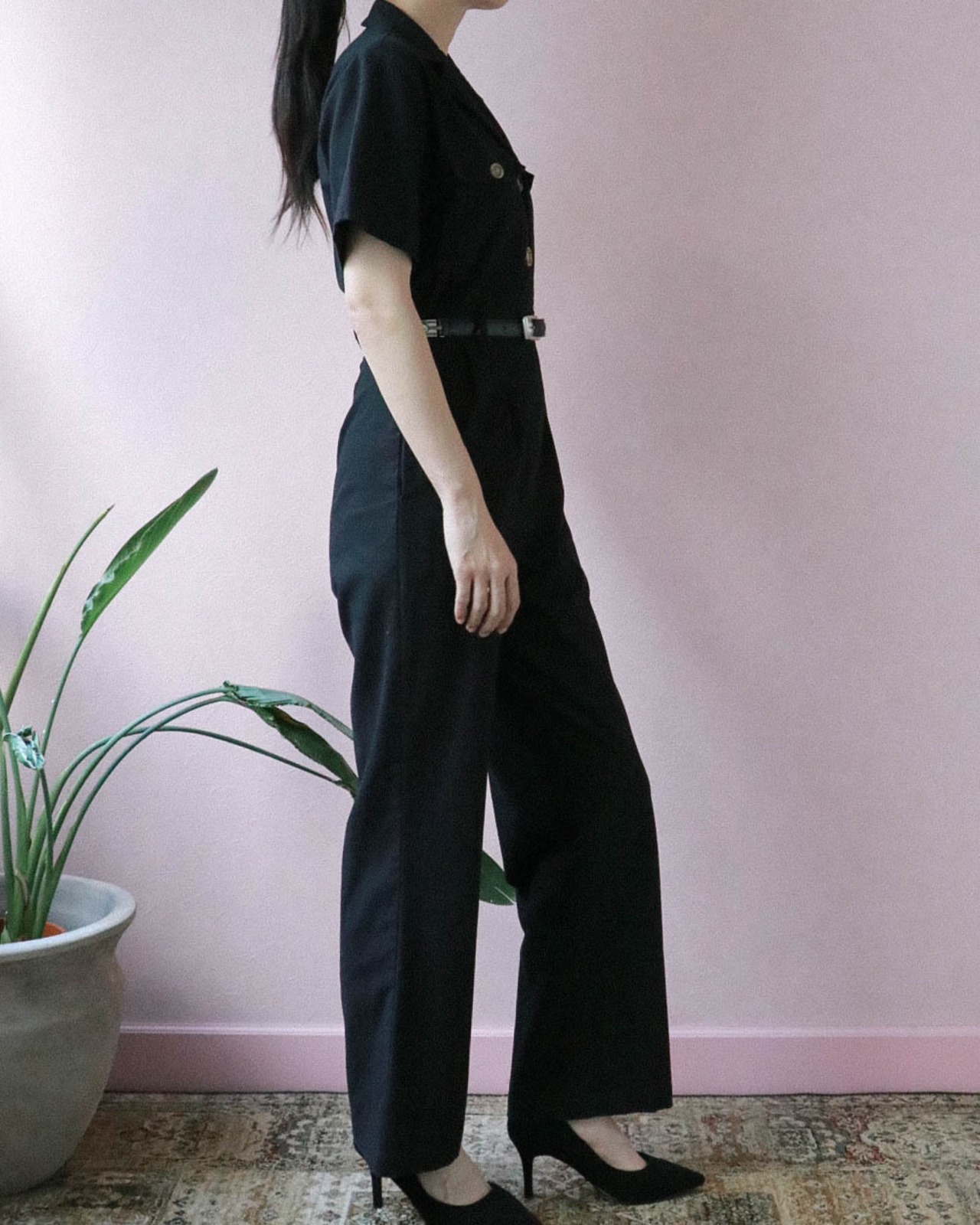 クラシックなブラックカラーのオールインワン。コットンのようなしっかりとした素材感に袖有りの安心感。女性の気になる部分をうまくカバーし、ワイドパンツでスタイルよく魅せてくれるシルエットの良さで重宝します。