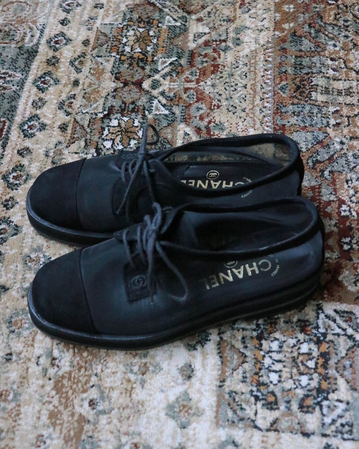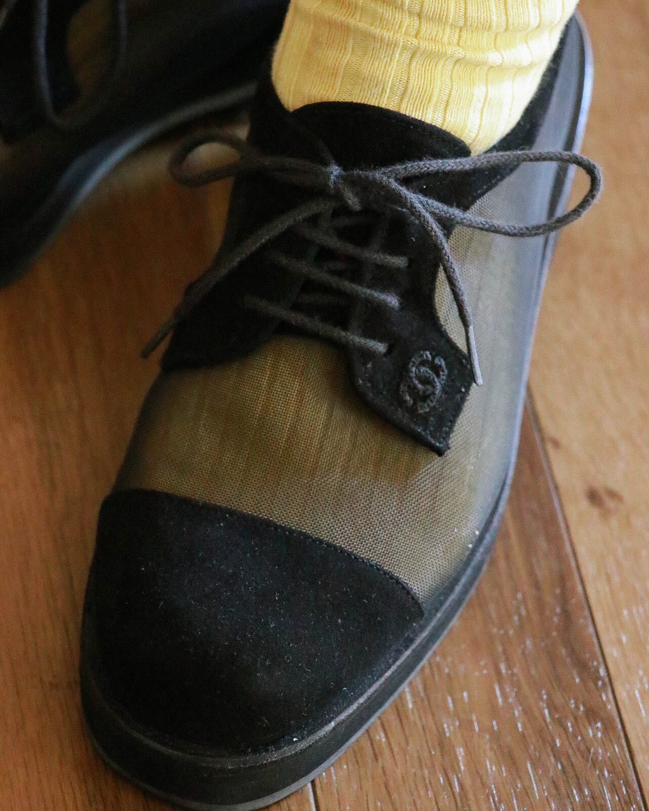 刺繍されたシャネルロゴがフロントに施されたレースアップシューズ。肌とのコントラストをメッシュが魅せる上品なコケティッシュさは、さすがのシャネル。女性の足元を美しく演出する計算され尽くしたフォルム美は惚れ惚れする。履くだけで背筋の伸びるシューズはコンディションも良好でお勧めです。