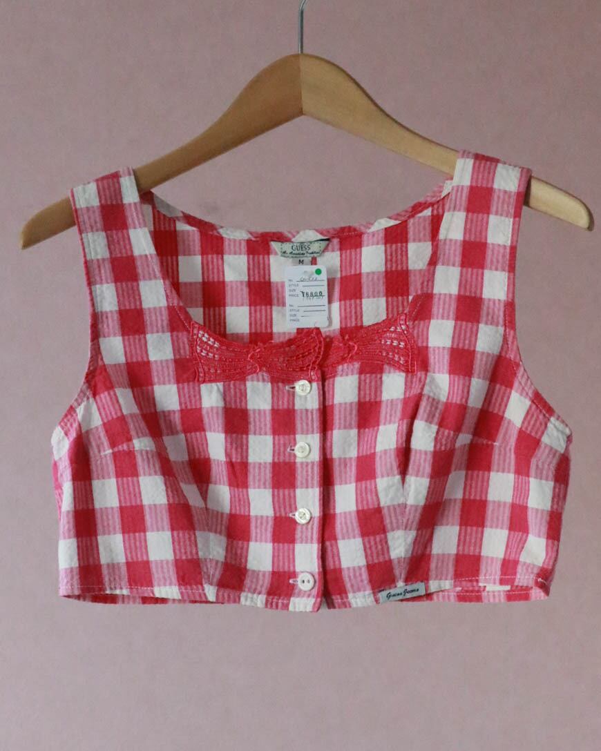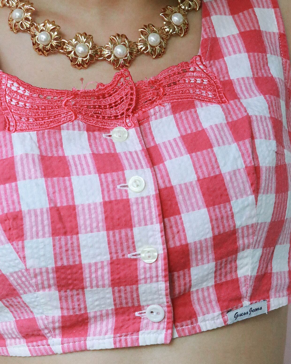 Y2Kファッションを彷彿とさせるトップスはGUESS。