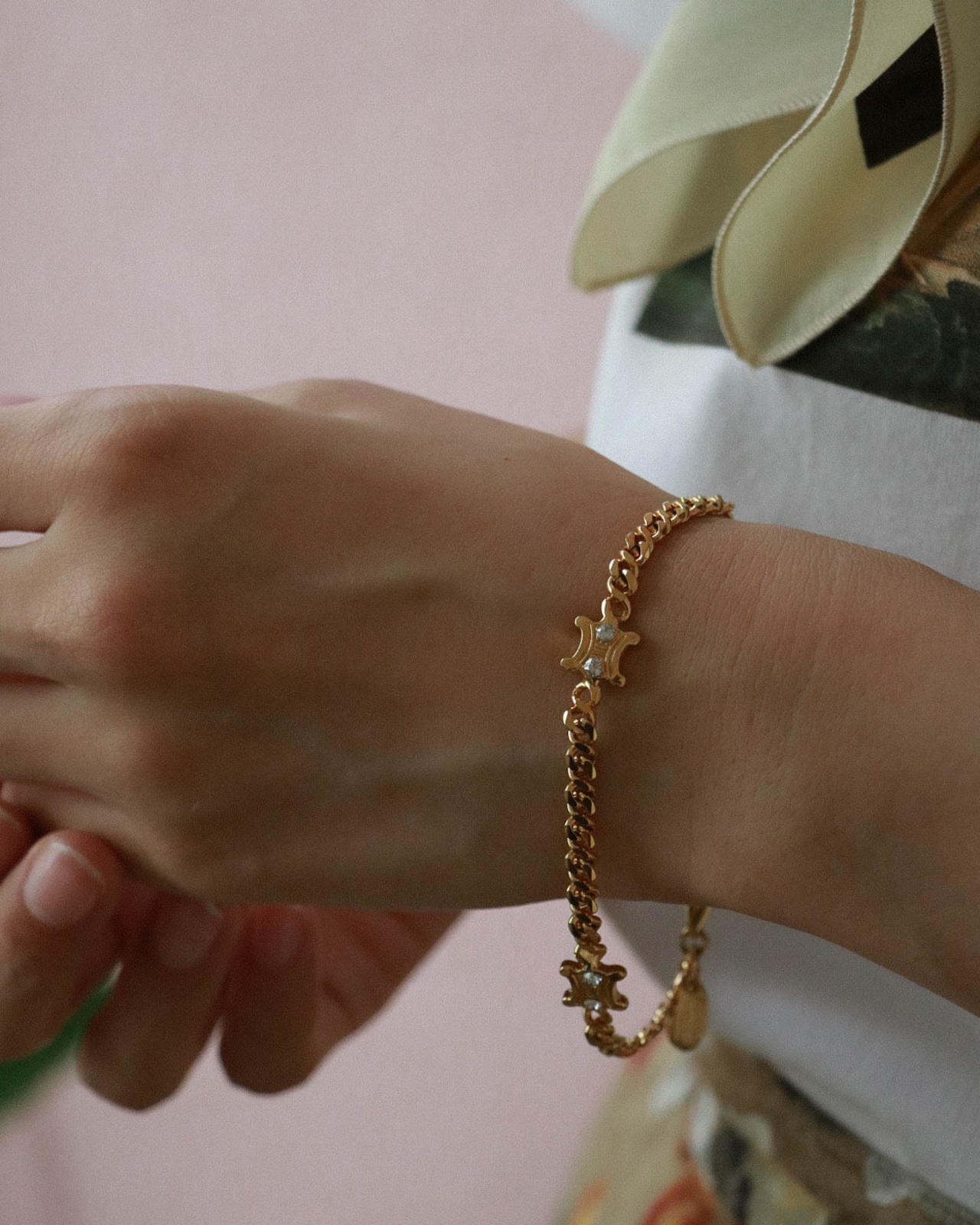 セリーヌのブレスレットが入荷。手元を飾るブレスレットはオールシーズン必須のアイテムの一つです。華奢なチェーンにラインストーンをあしらえたトリオンフチャームがリズムよく並ぶ。一点で身につけるのはもちろん、お手持ちのブレスレットと合わせて華やかさをプラスしてみてはいかがでしょうか。