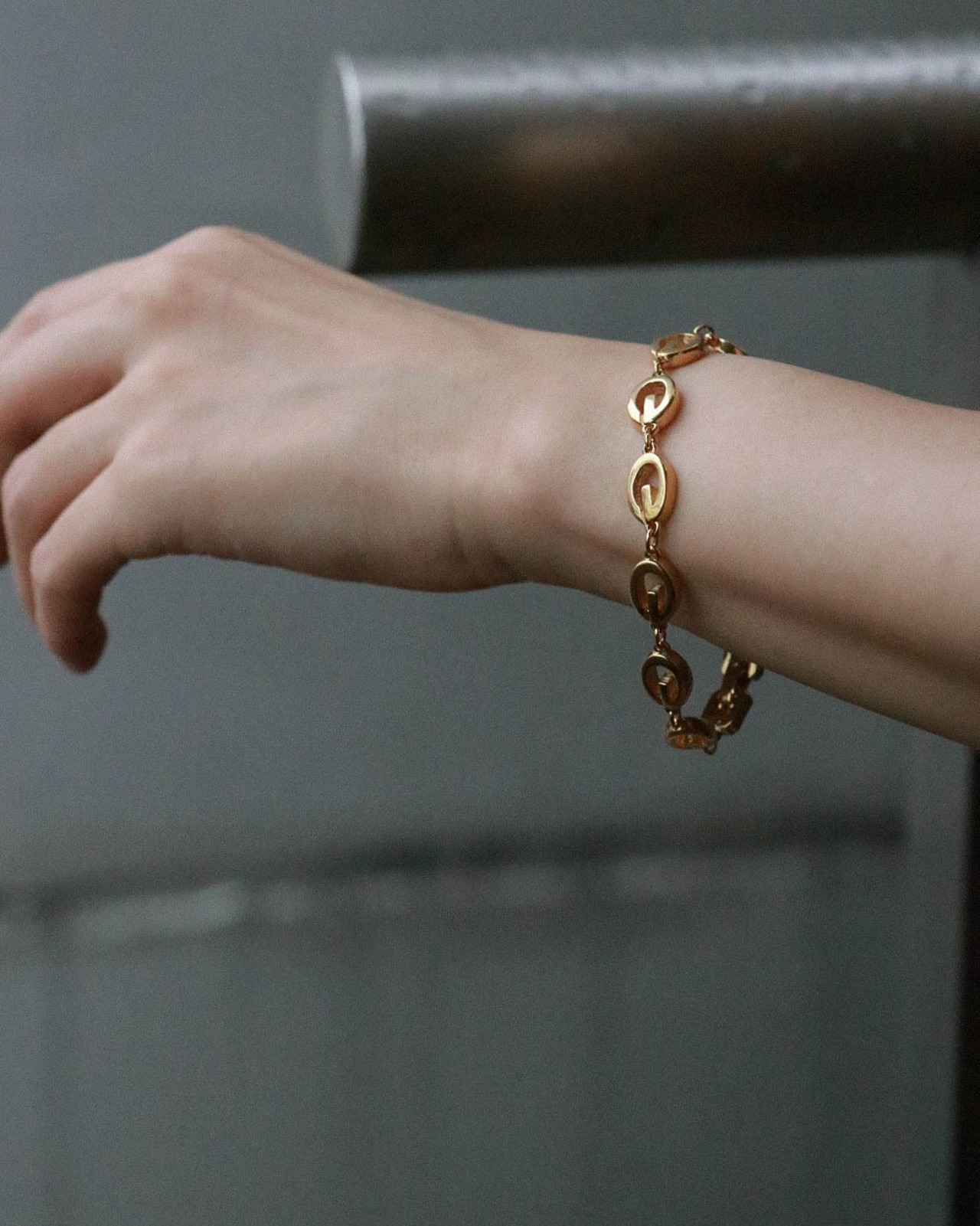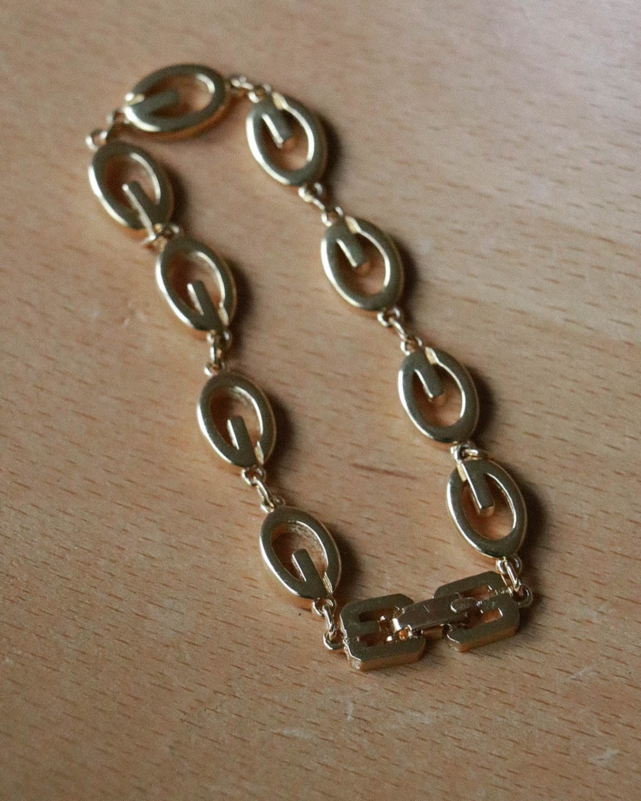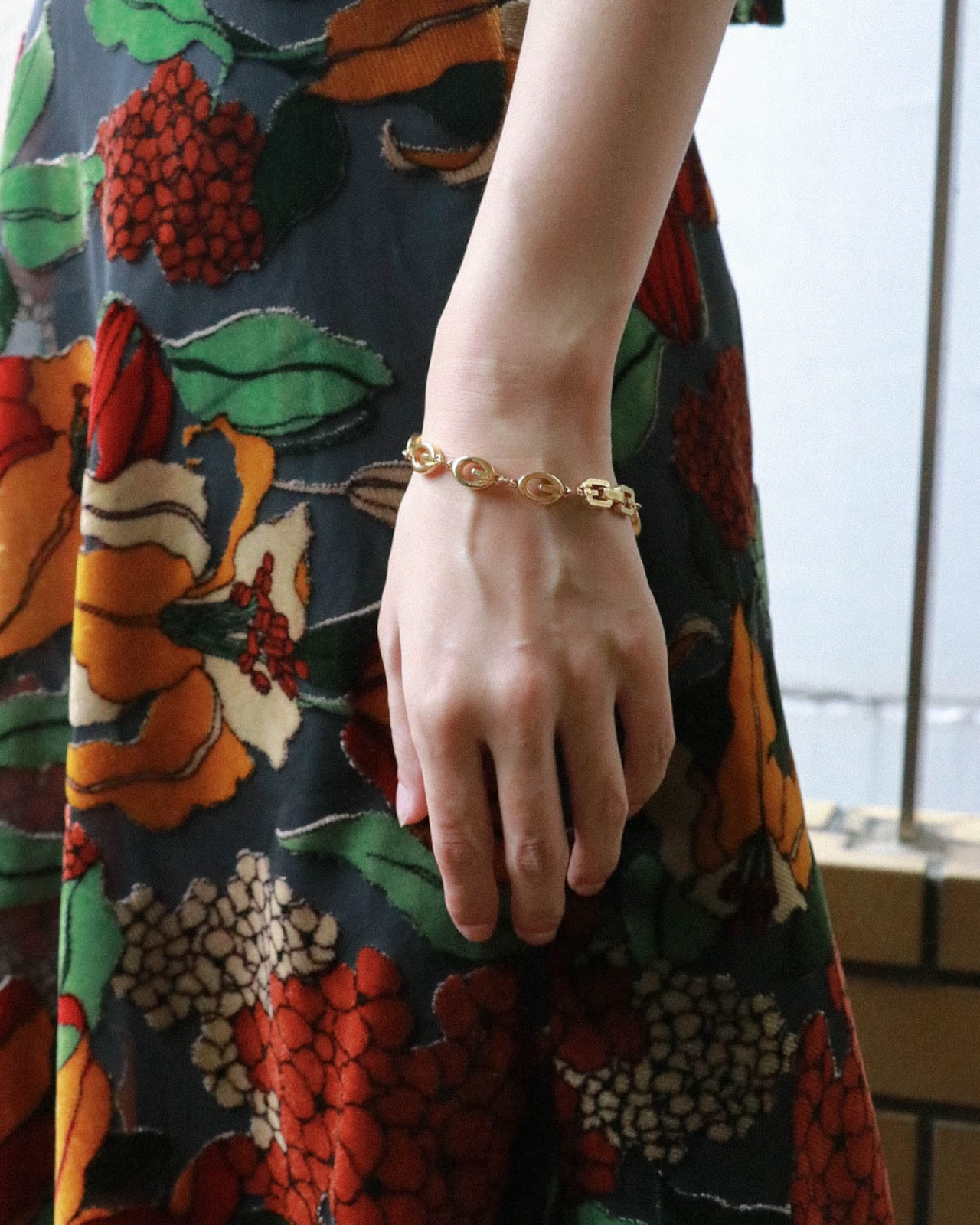 "G"ロゴが連なるGIVENCHYのブレスレットが、手元をハイセンスに彩る。