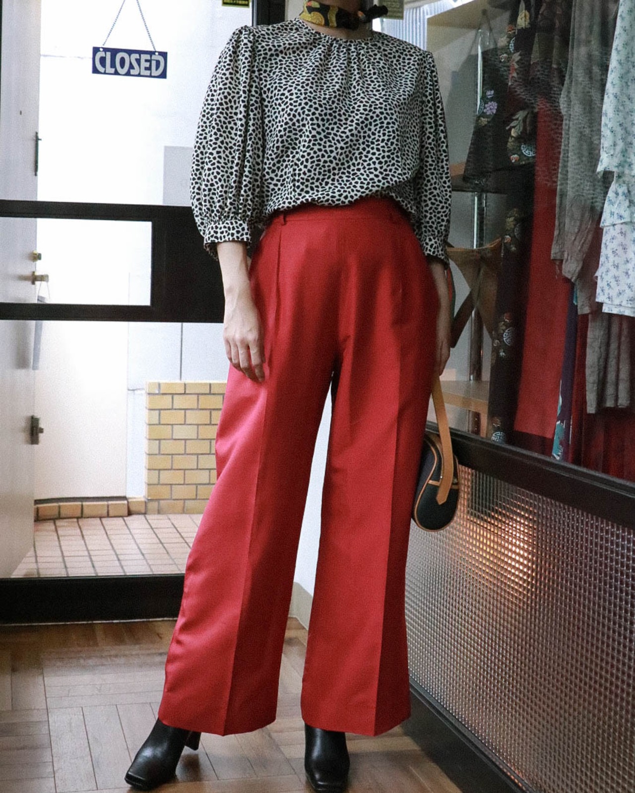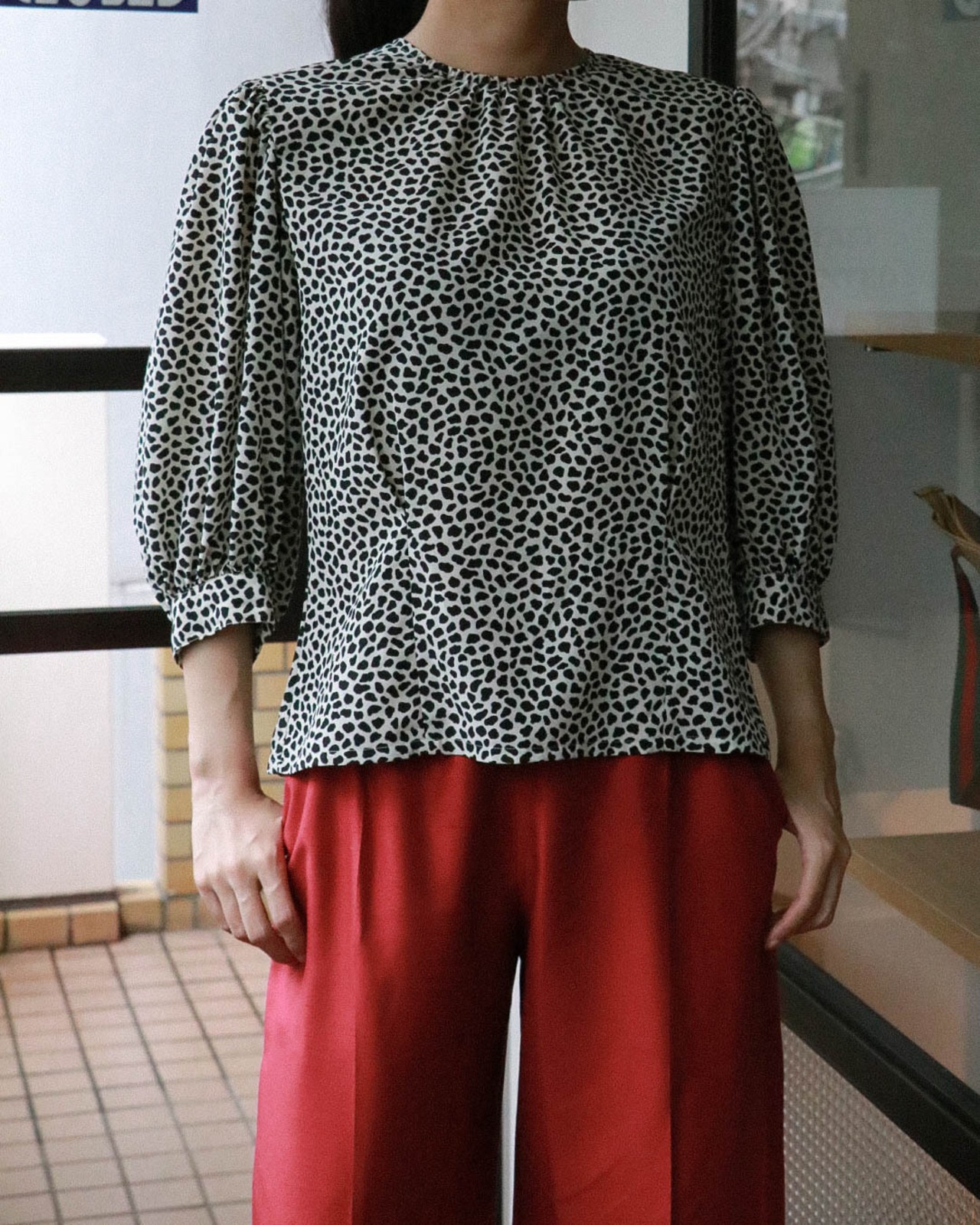 コーディネートの主役になるヴィンテージブラウスが入荷。B&Wのクラシックな組み合わせがアニマル風プリントにより遊び心のある大人のクラシックフェミニンスタイルが完成します。一年中使える素材感で、様々なオーケーションで活躍する一着。