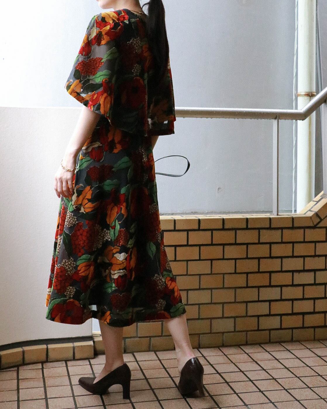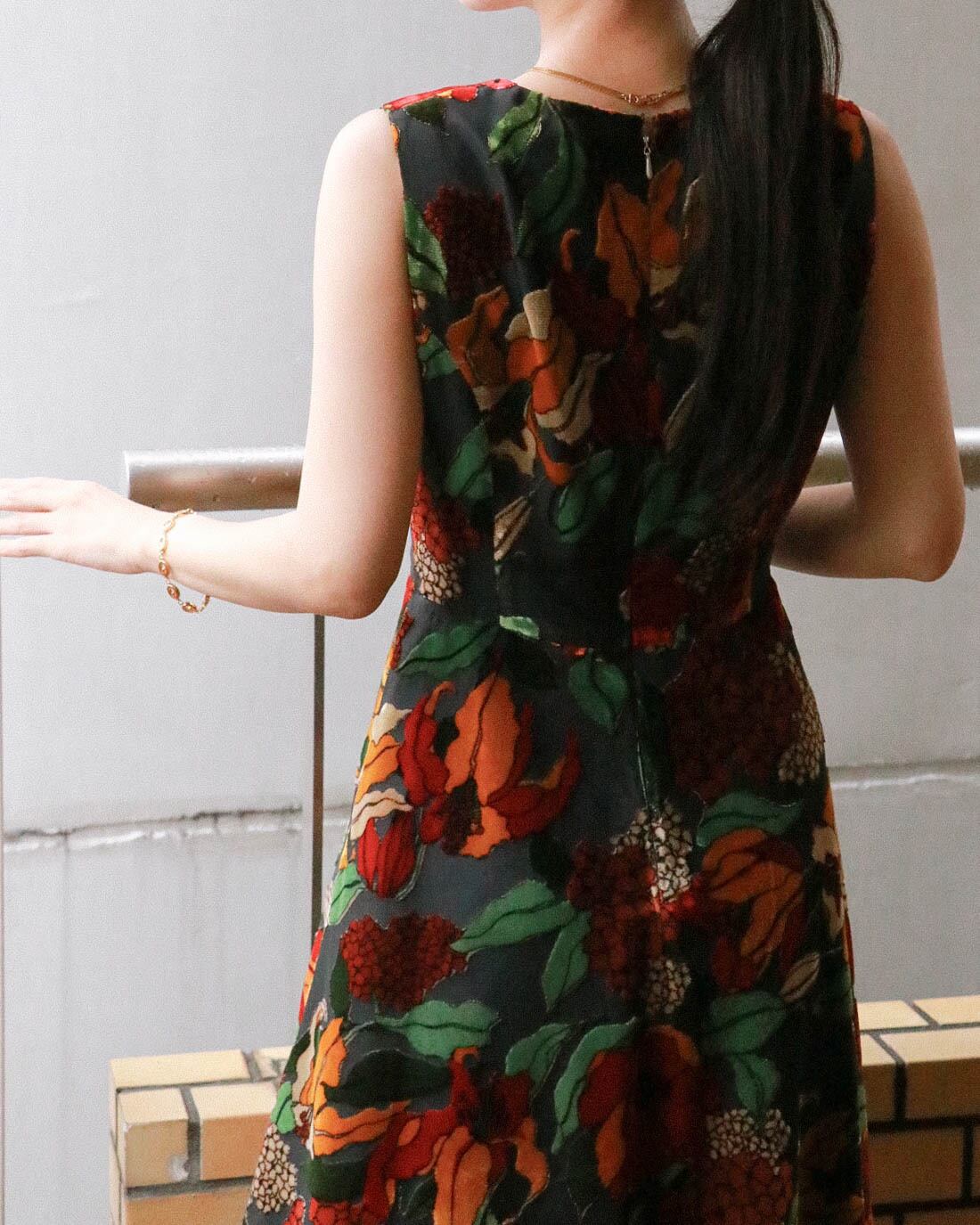 纏えば一気に秋ムードになるベロア素材のドレス。ノースリーブ、Vネックのフレアワンピースと同生地のボレロがセットになってます。ブラックベースにカラフルなお花やフルーツモチーフデザインがクラシックな印象に。更に、ベロア特有の光沢感や美しいシルエットが、優婉な大人レディを演出します。シースルーの素材ですが、ワンピースはしっかりと裏地が付いてます。寒い季節はインナーにニットトップス重ねて、自分だけの一点ものをお楽しみください。