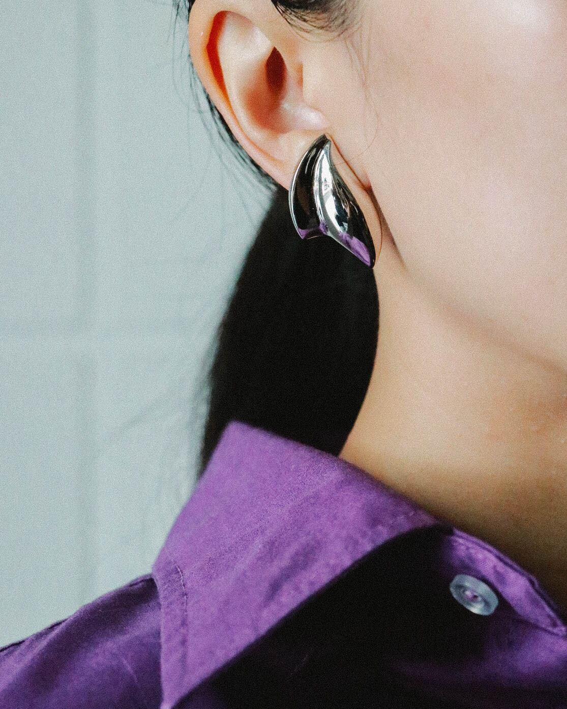 程よい大きさのサイズ感が着け心地がいい。シルバーカラーのイヤリングが入荷しました。美しい曲線が上品さのアクセントに。80年代らしいモードなデザインはどんなシーンにも馴染みます。