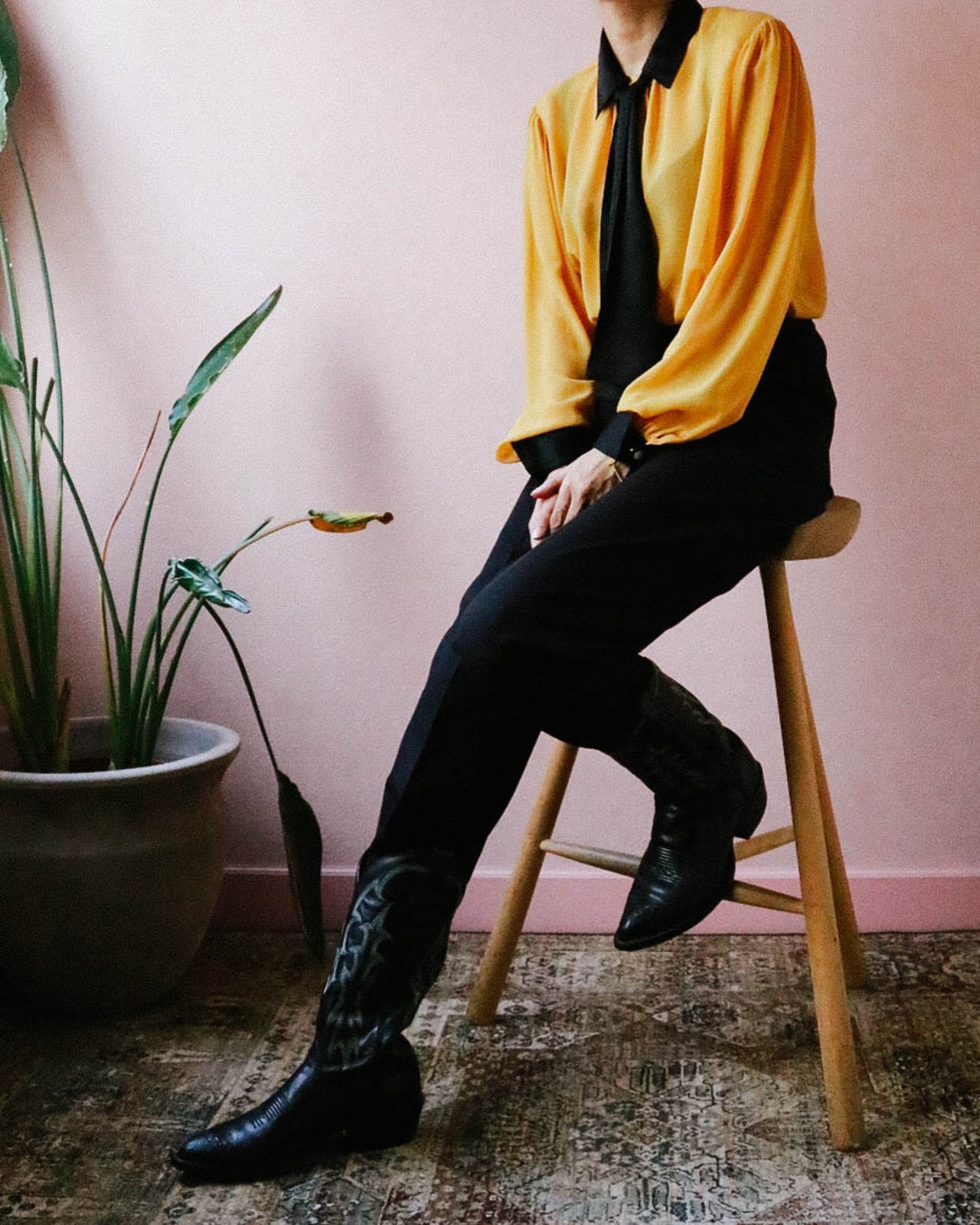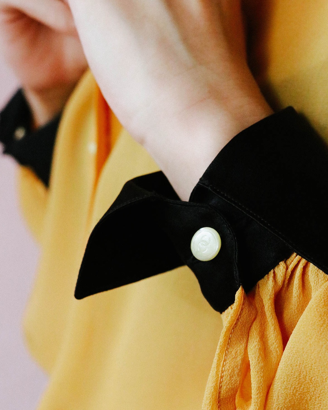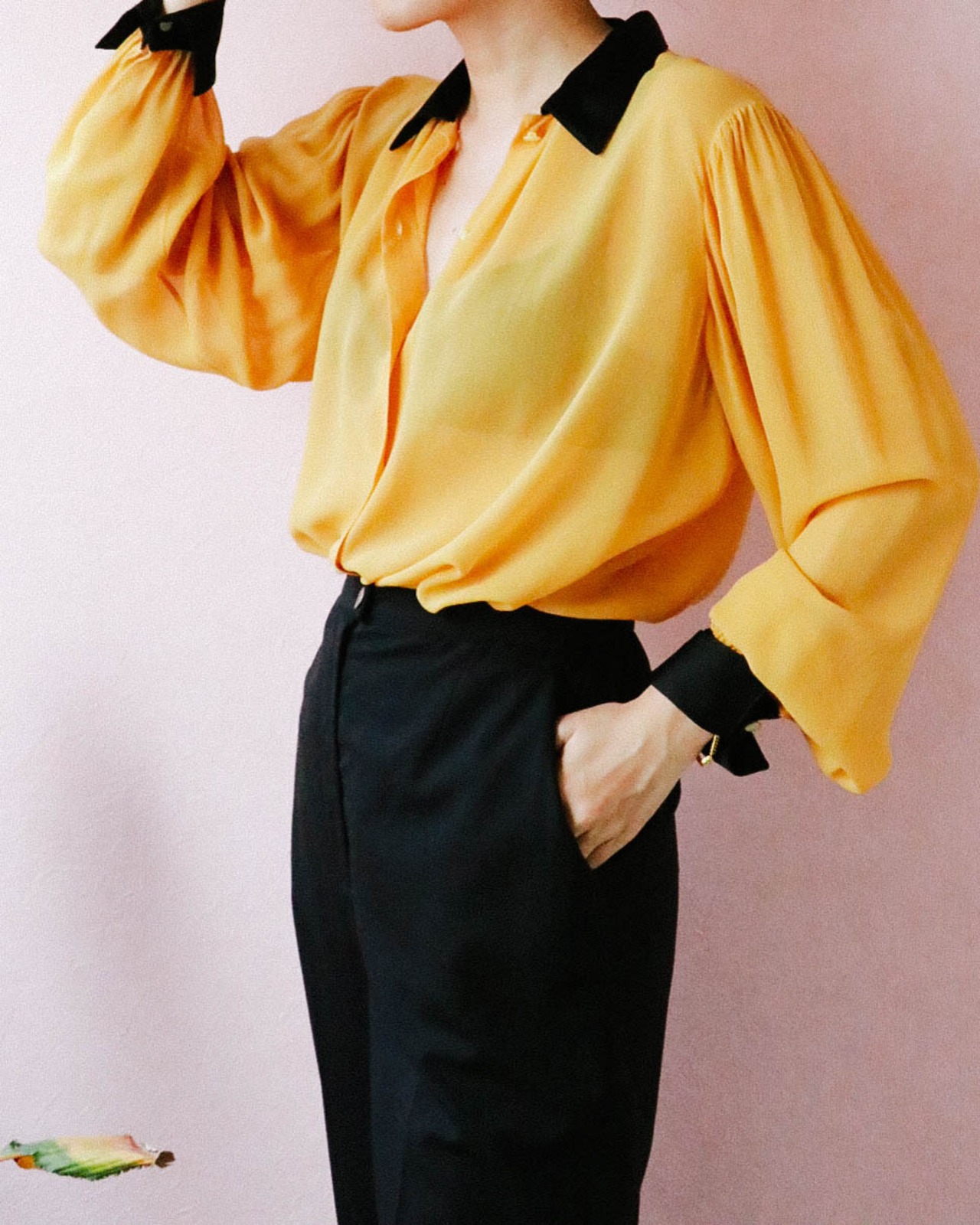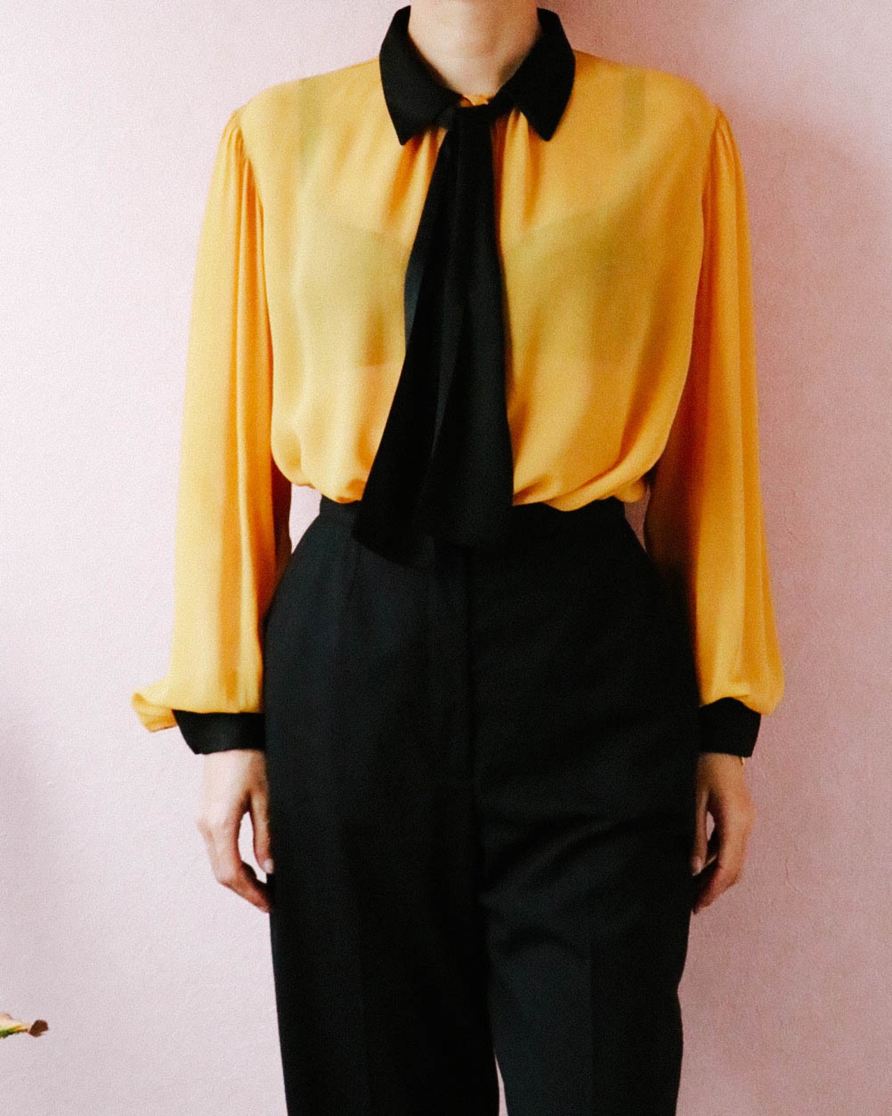 表記はないですが透け感のあるイエロー生地はおそらくシルクシフォン、ブラック生地は艶のあるシルクで生地のコントラストも美しい。