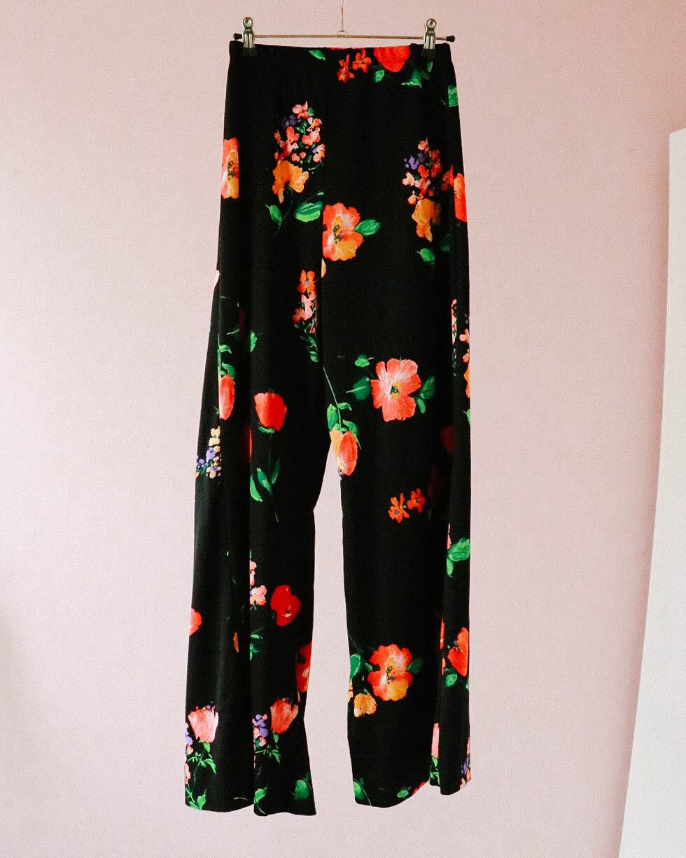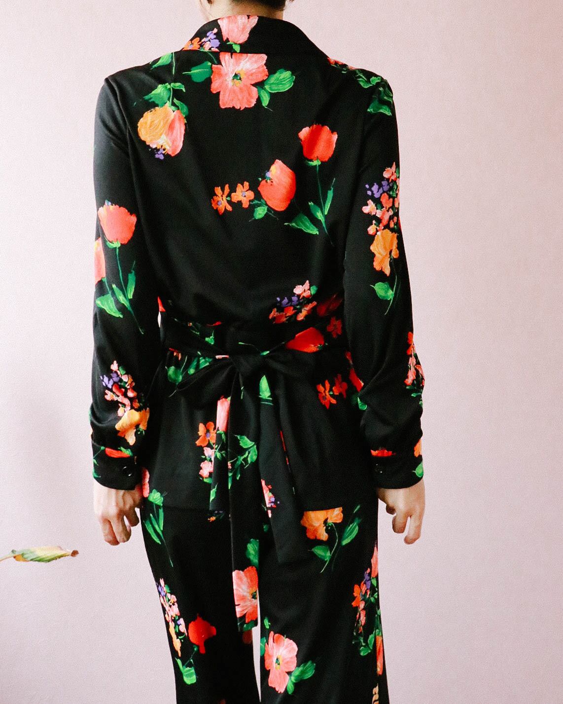 黒地に美しい花々が咲き誇るこちらのセットアップは、1970年代のもの。
