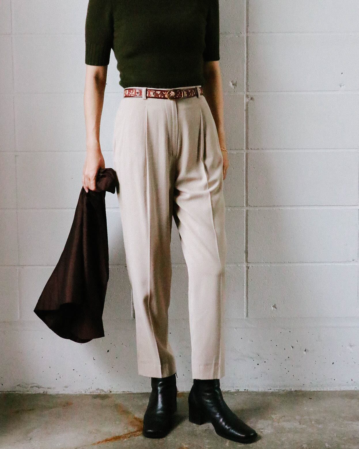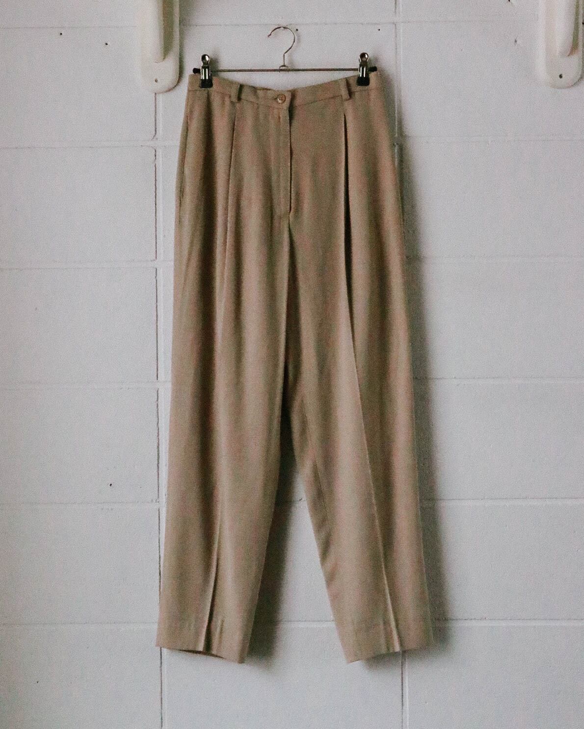 柔らかい色味のベージュスラックス。ハイライズに程良いワイドシルエットと万能に使えるパンツ。