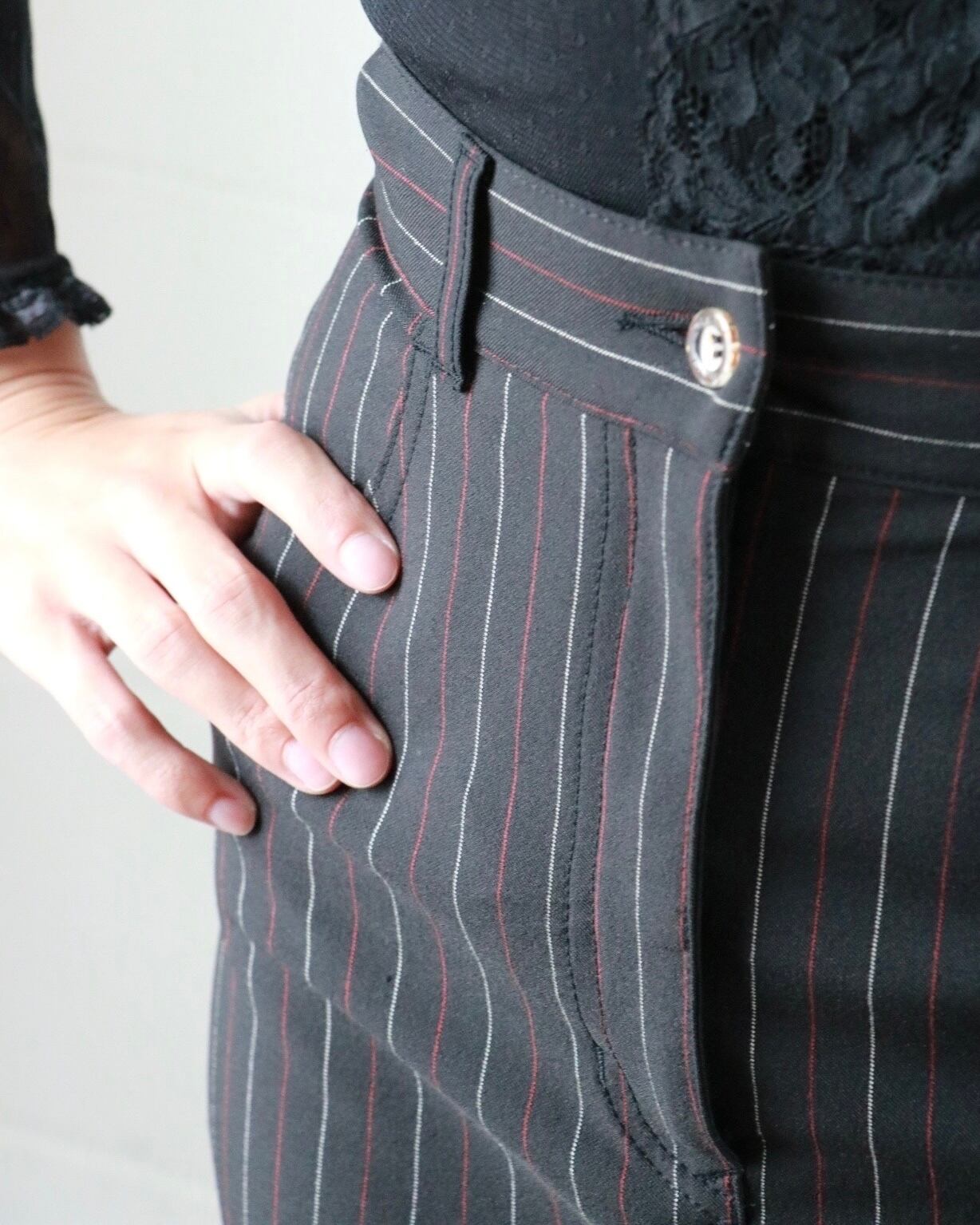 ストライプのロングスカートはメゾンブランドフェンディ。黒ベースにストレッチが効いた素材感、履き心地がとってもよく、お好みのトップスに合わせて一年中大活躍できます。