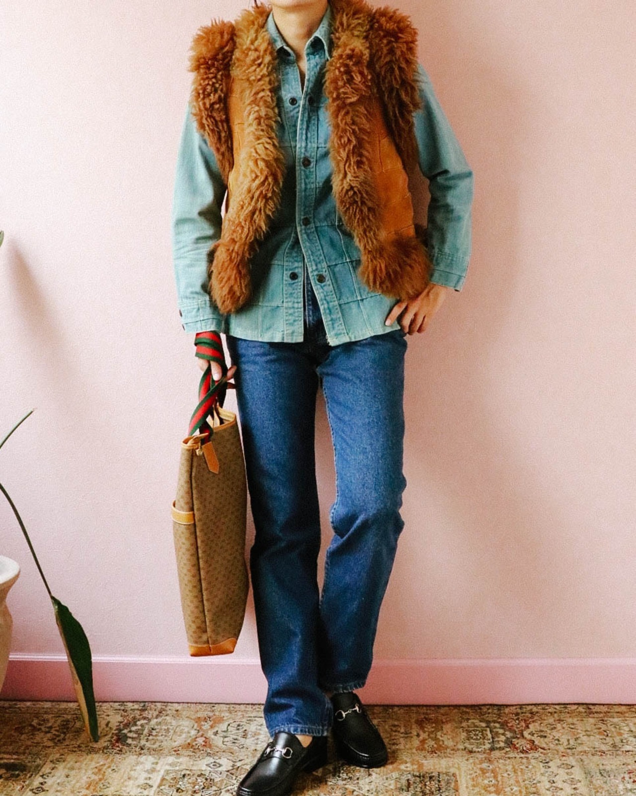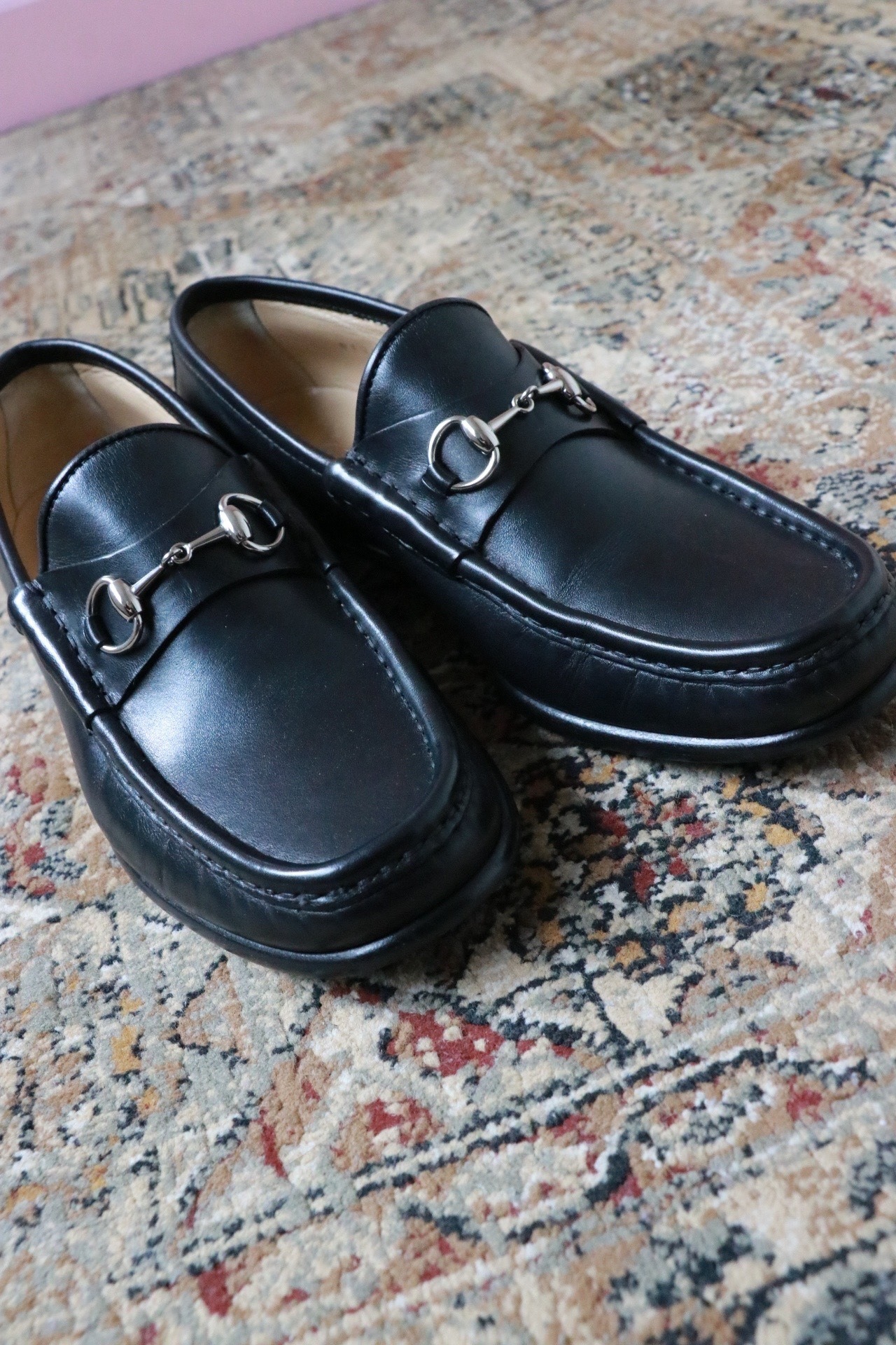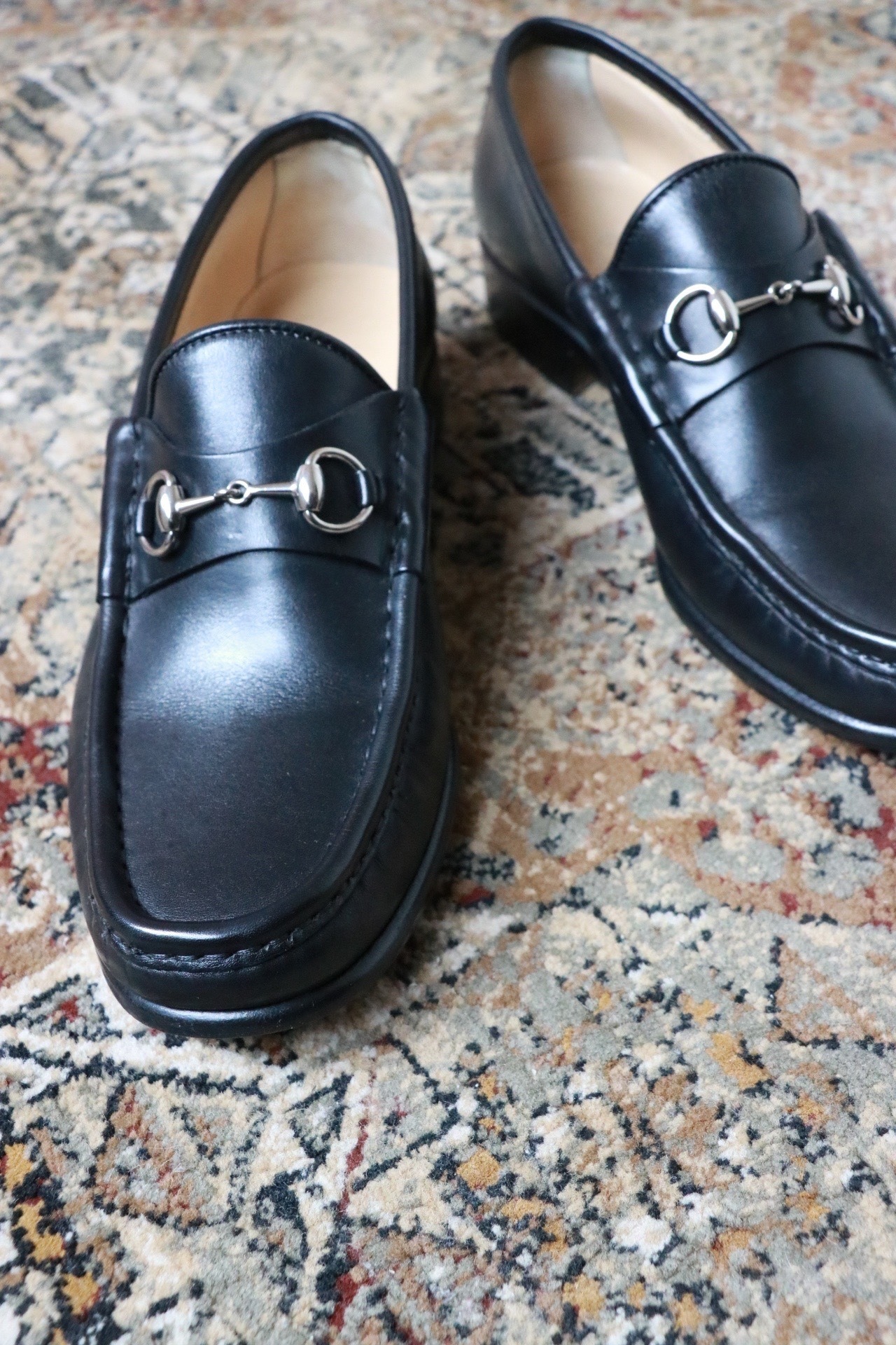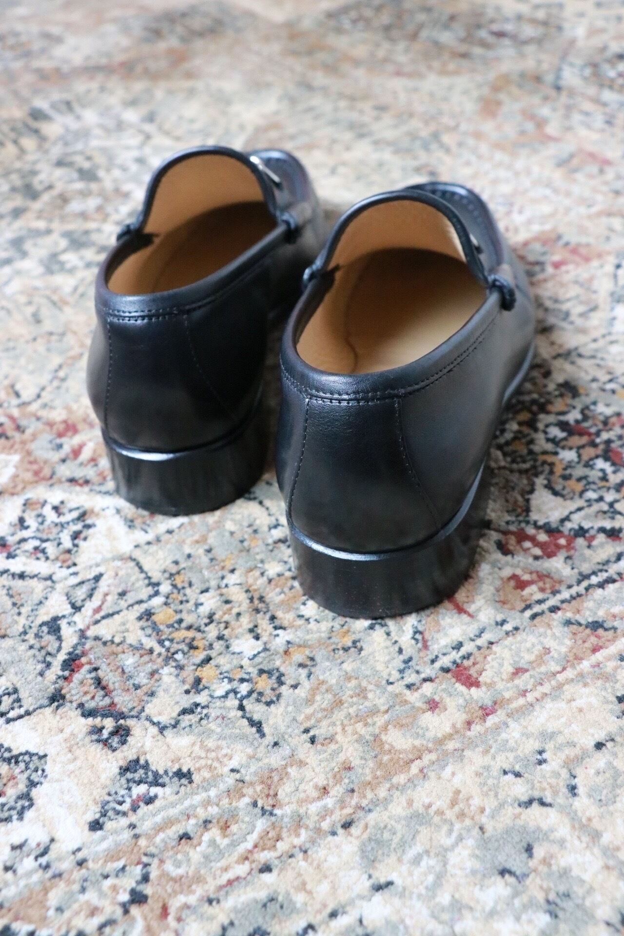 グッチのビットローファー。ベーシックなブラックカラー。いくつかある形の中、こちらはより女性らしいシルエットが魅力的な一足。