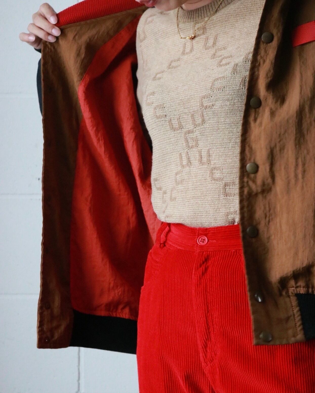 写真のようにカジュアルモードに着こなすのはもちろん、ボウタイブラウスや綺麗目ボトムスと合わせて、エクレクティックなコーディネートを楽しむのもオススメ。