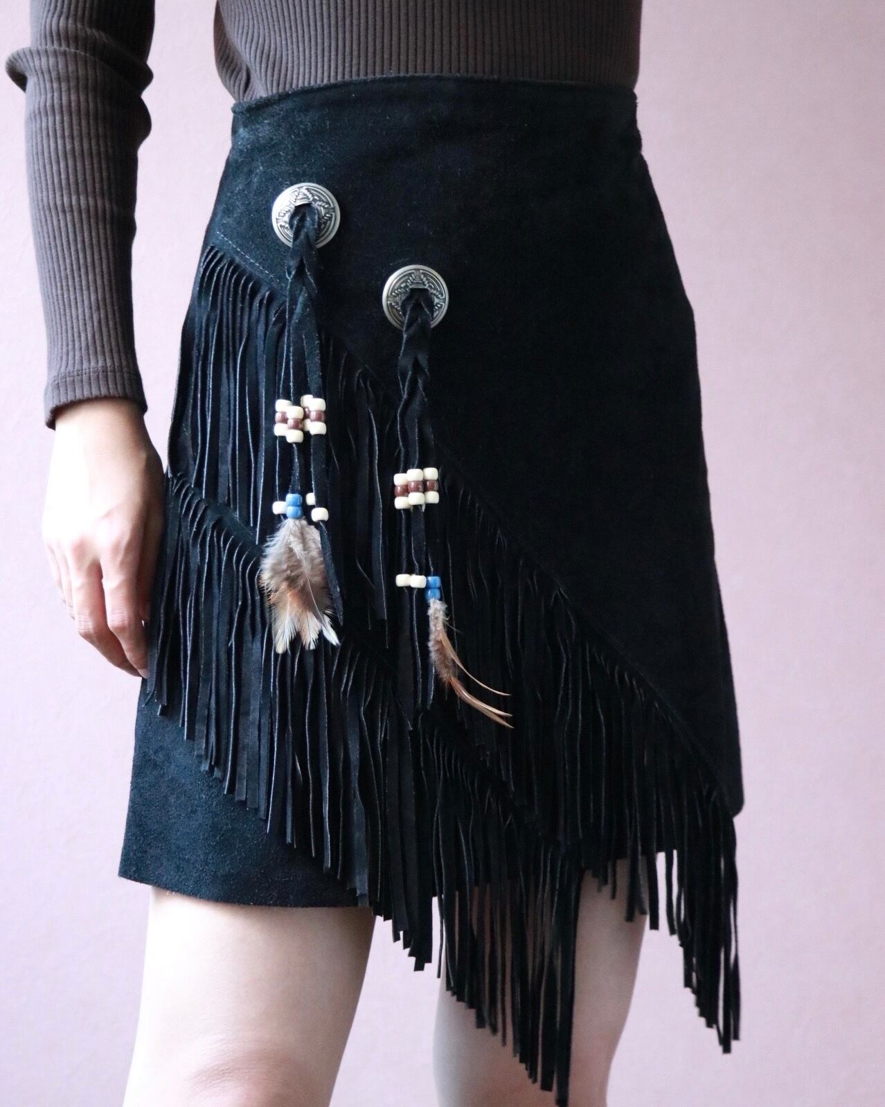 ダイナミックに動くフリンジが存在感を放つスエードスカートは、1970年代のもの。