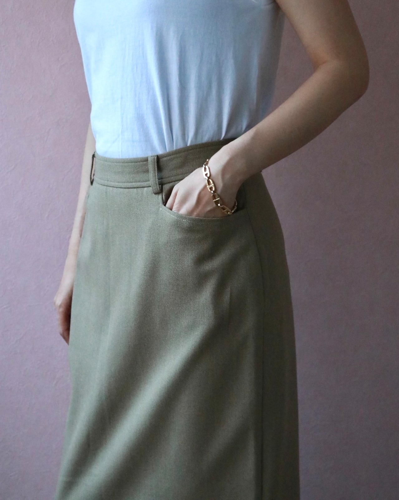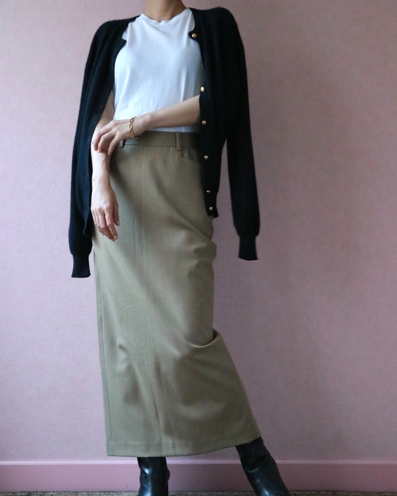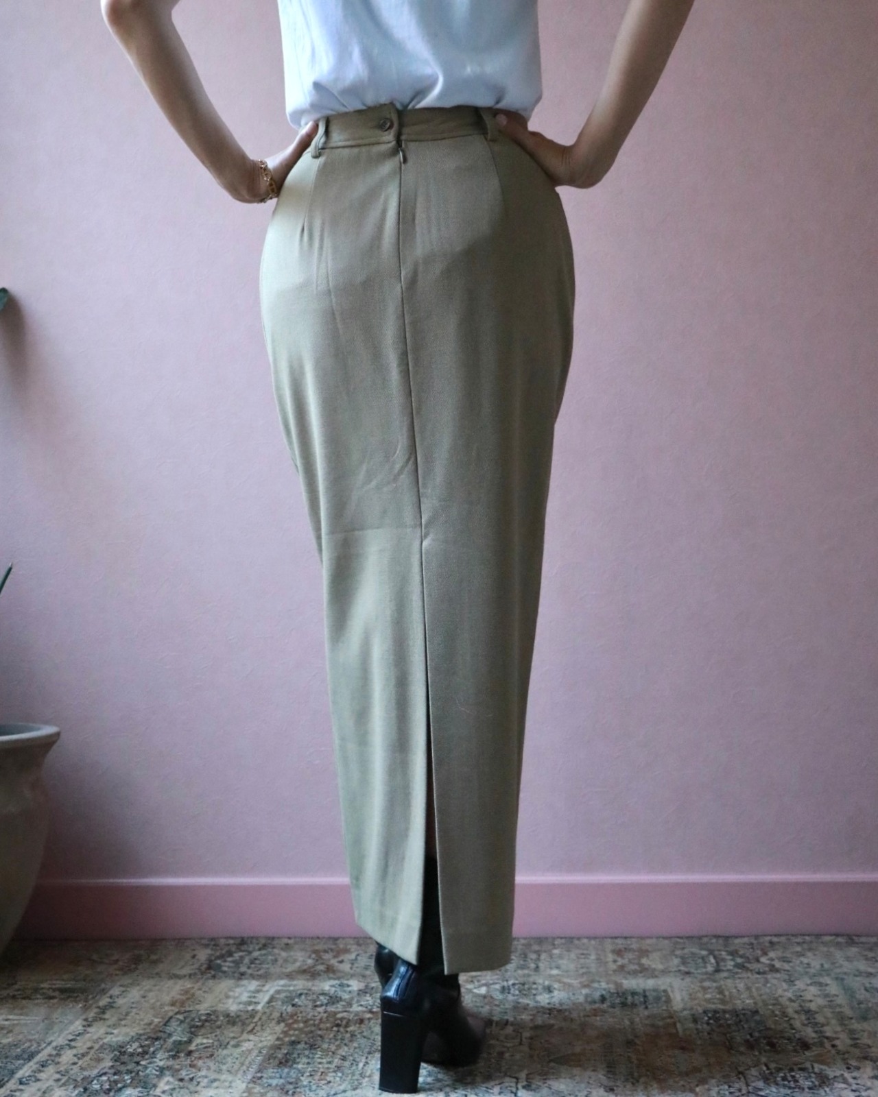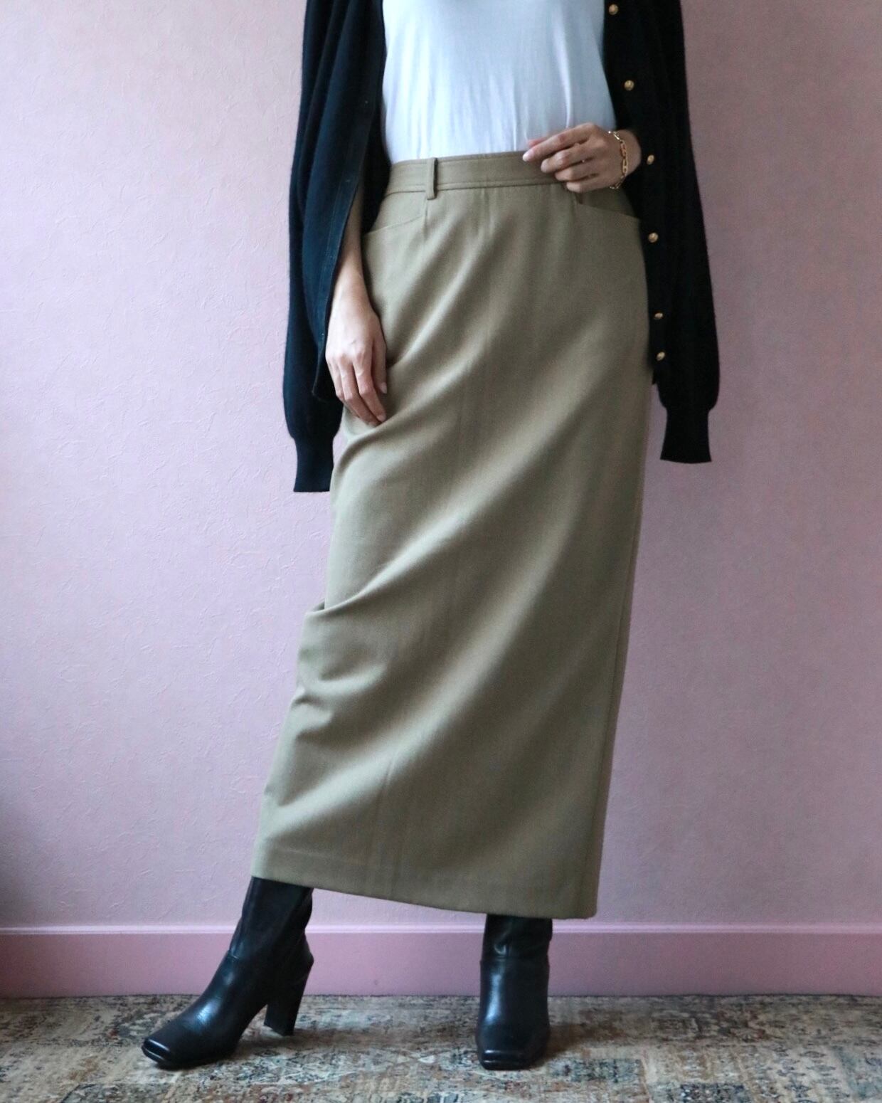 深めのバックスリットはロングのタイトスカートで懸念しがちな動きにくさがなく、上品で保守的なフロントスタイルに対し女性らしさを忘れない、ラルフローレンらしい一着。
