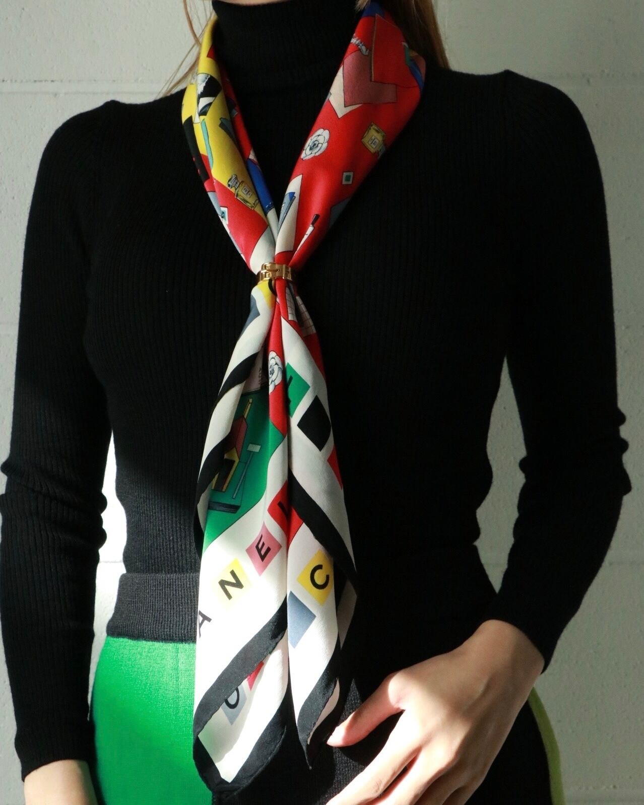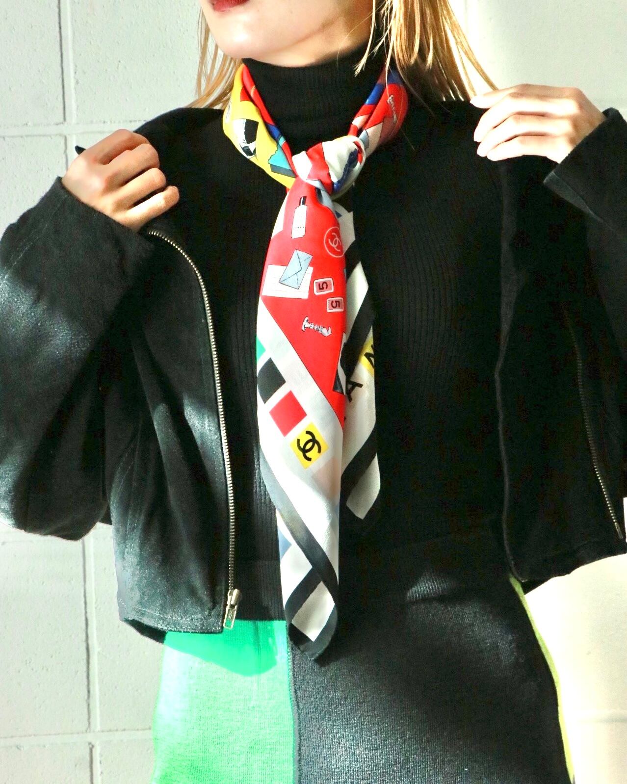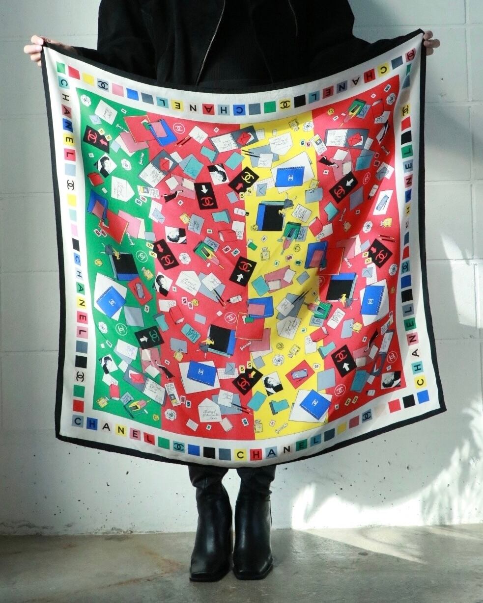 ココシャネルが描かれたクラシカルなデザインの大判スカーフはCHANELのもの。
