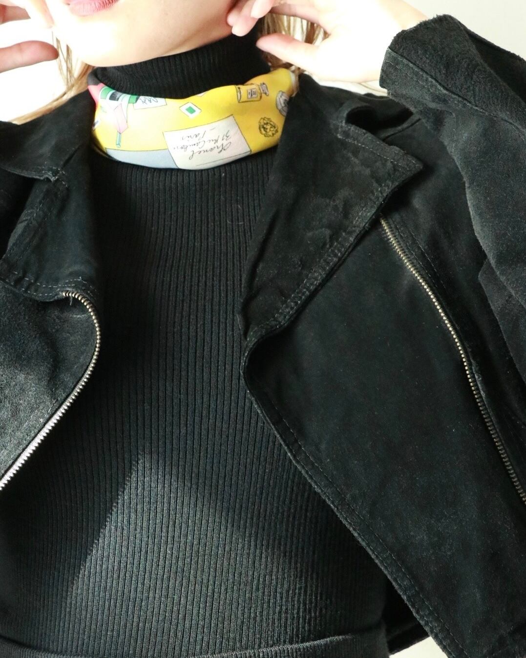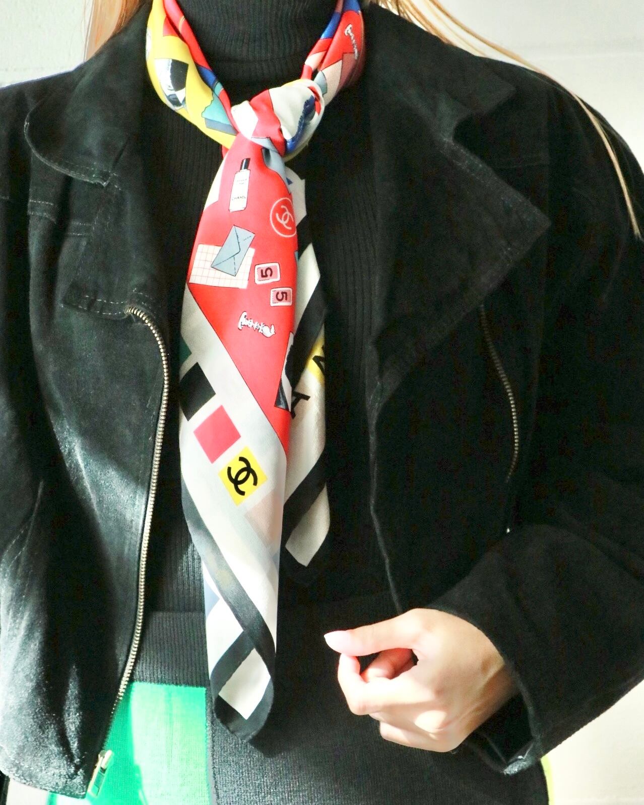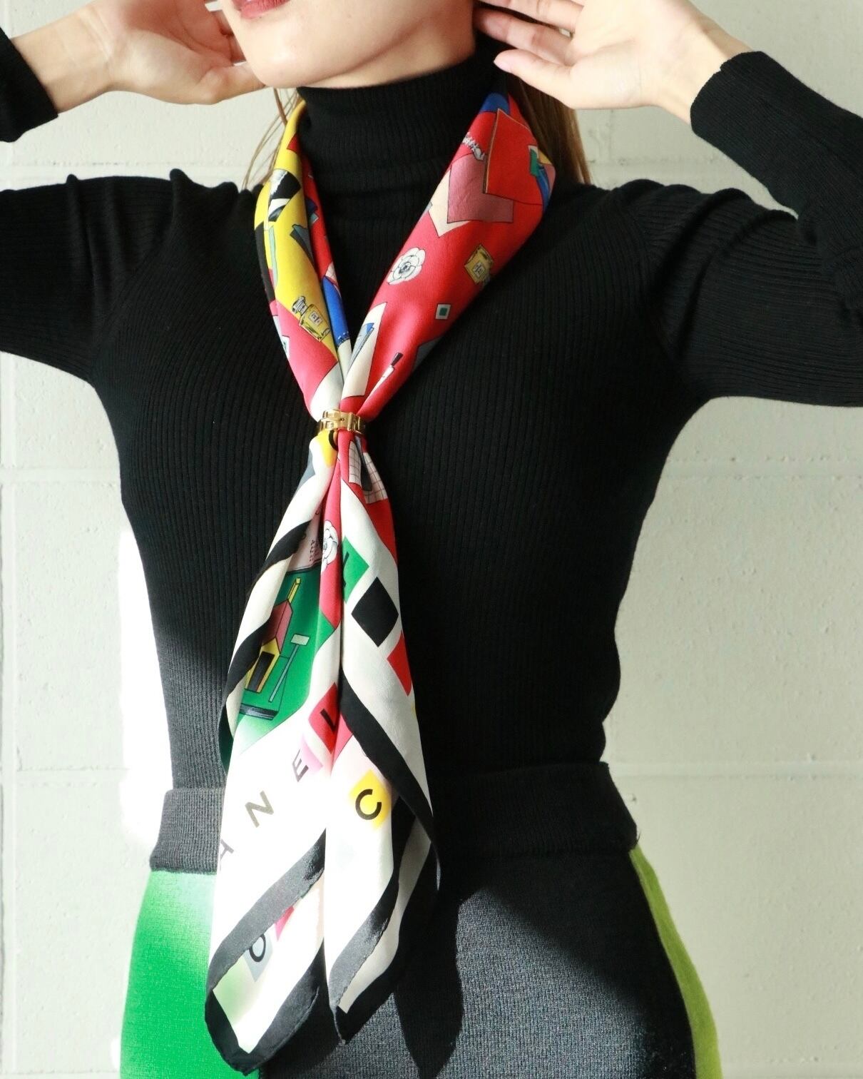 ココシャネルが描かれたクラシカルなデザインの大判スカーフはCHANELのもの。