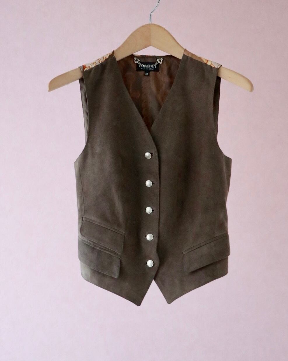 遊び心がありつつも上品な印象のベストトップスは、イタリア製GUCCIのもの。