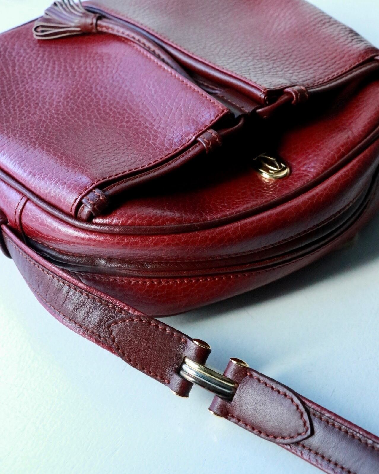 上品なボルドーカラーが目を惹くカルティエのショルダーバッグが入荷。こちらはポーチ付き!