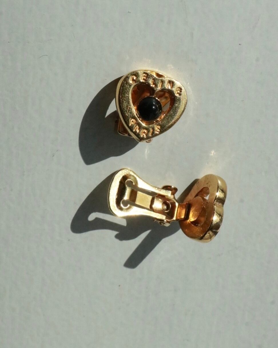セリーヌのハート型イヤリング。程よく肌が透けるデザインでゴールドが強くなりすぎず、馴染みながらもしっかりとアクセントに。ゴールドとブラックストーンとの組み合わせがとっても可愛い一点。