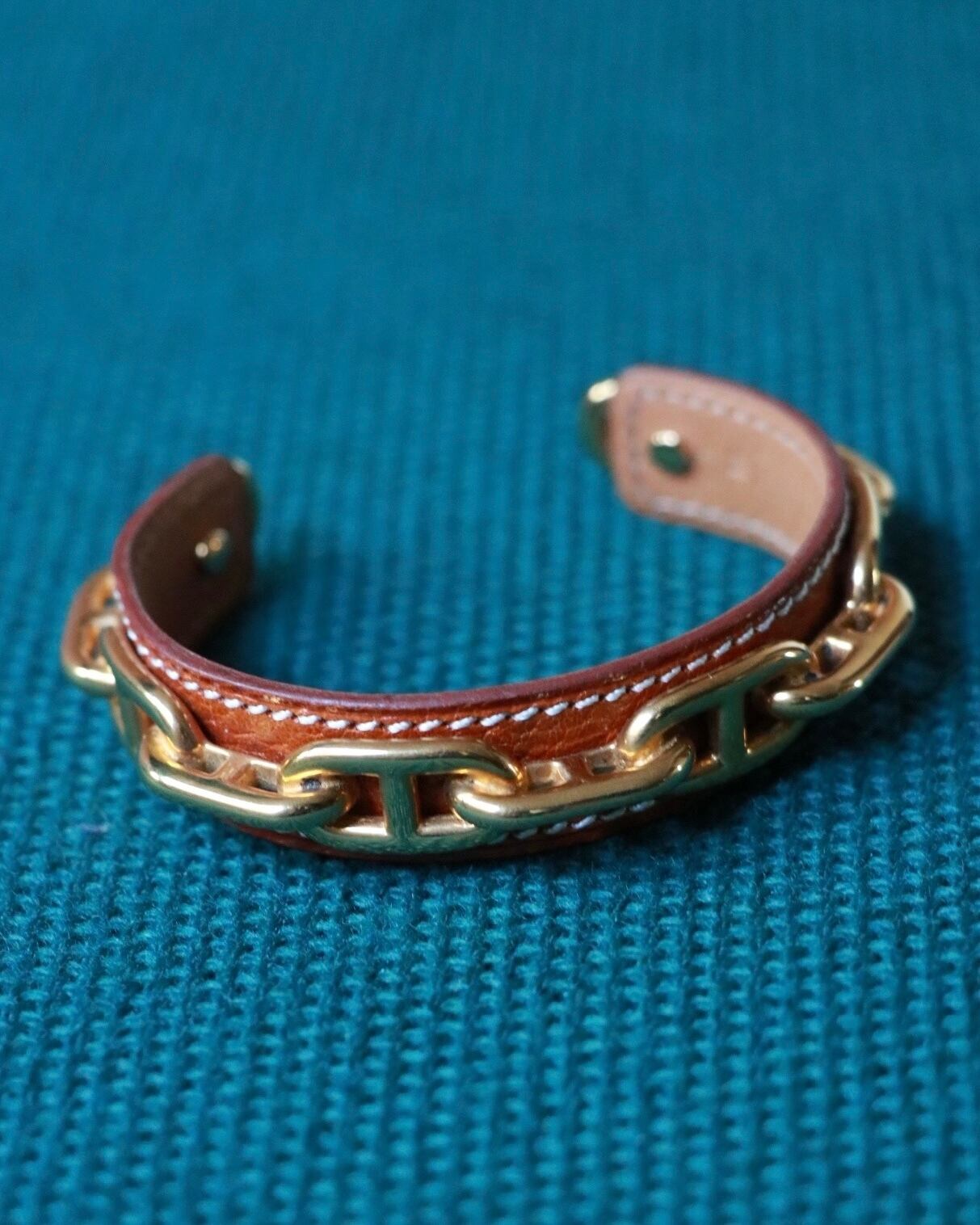 エルメス、2001一年製のバングルが入荷しました。オレンジブラウンのレザーをベースにジュエリーのように輝くゴールドのアクセントが手元をエレガントに演出します。