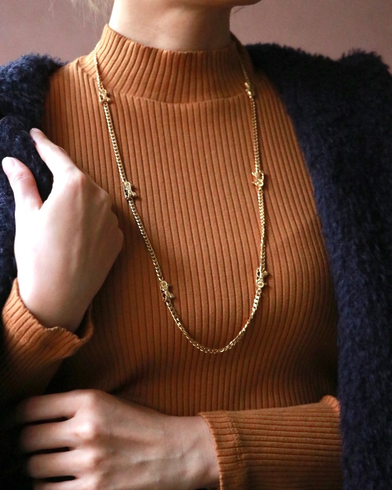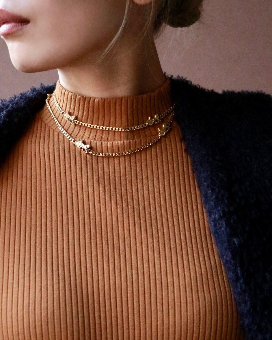 不動の人気を誇る馬車柄がモチーフとなったセリーヌのチェーンネックレス。太すぎず華奢すぎずな存在感はやはり使いやすい。無地のプレーンなトップスやワンピースのアクセントにも大活躍。手持ちのネックレスとの重ねづけも楽しみたい。