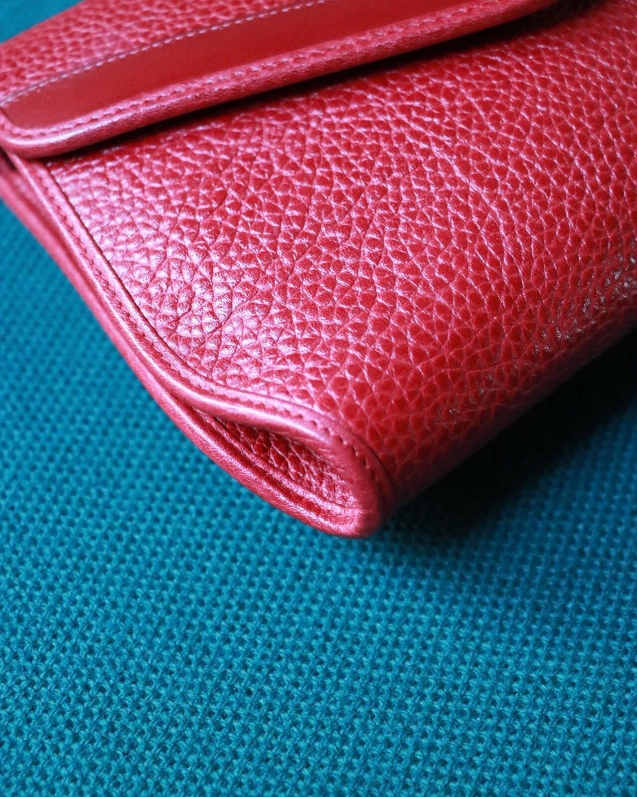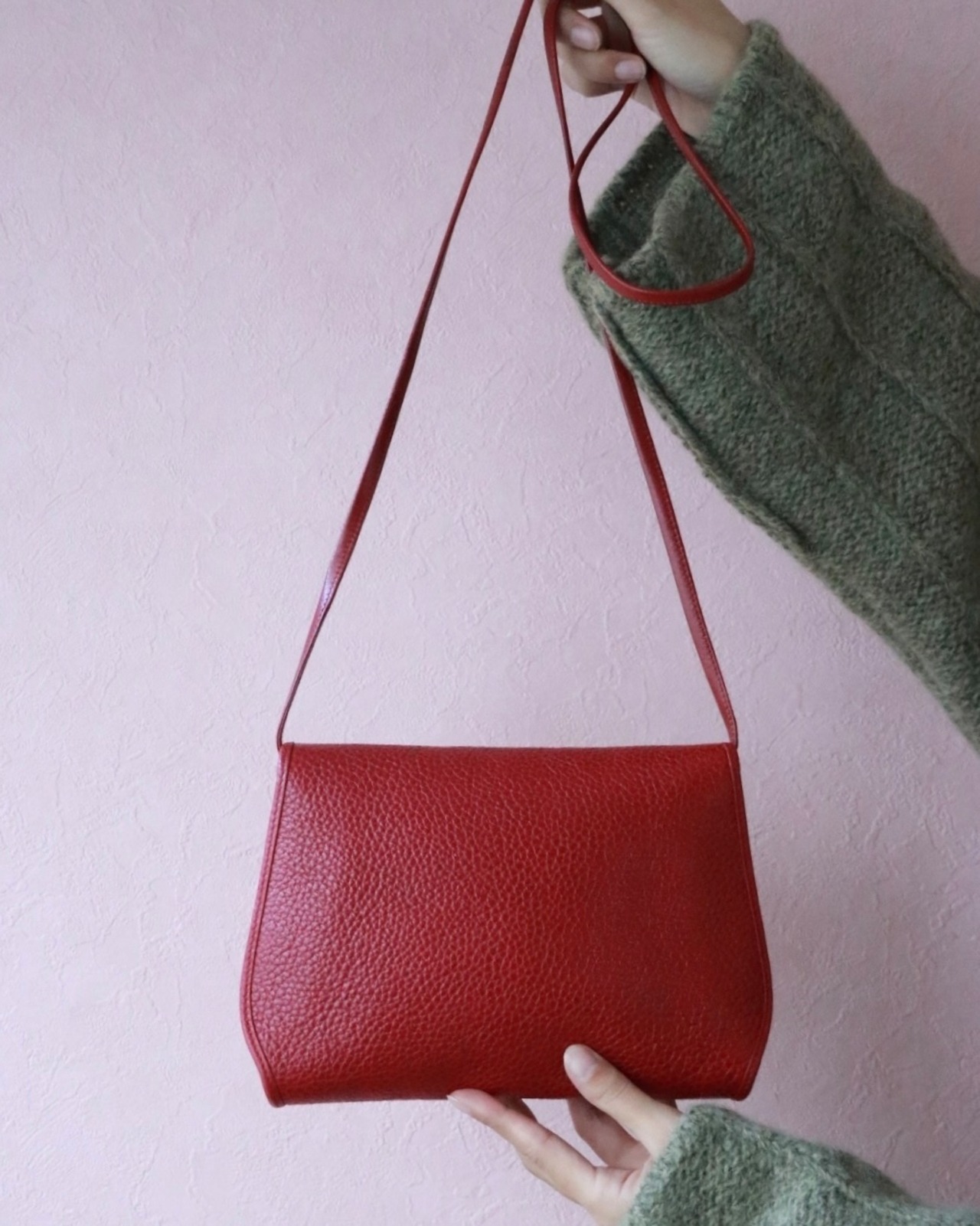乙女心にキュンとくる、絶妙な明るさのレッドカラー、型押レザーにスムースレザーで縁取られ立体的な印象とレターのようなフラップデザインが可愛い!内側にはチャック付ポケットもあり、安心です。