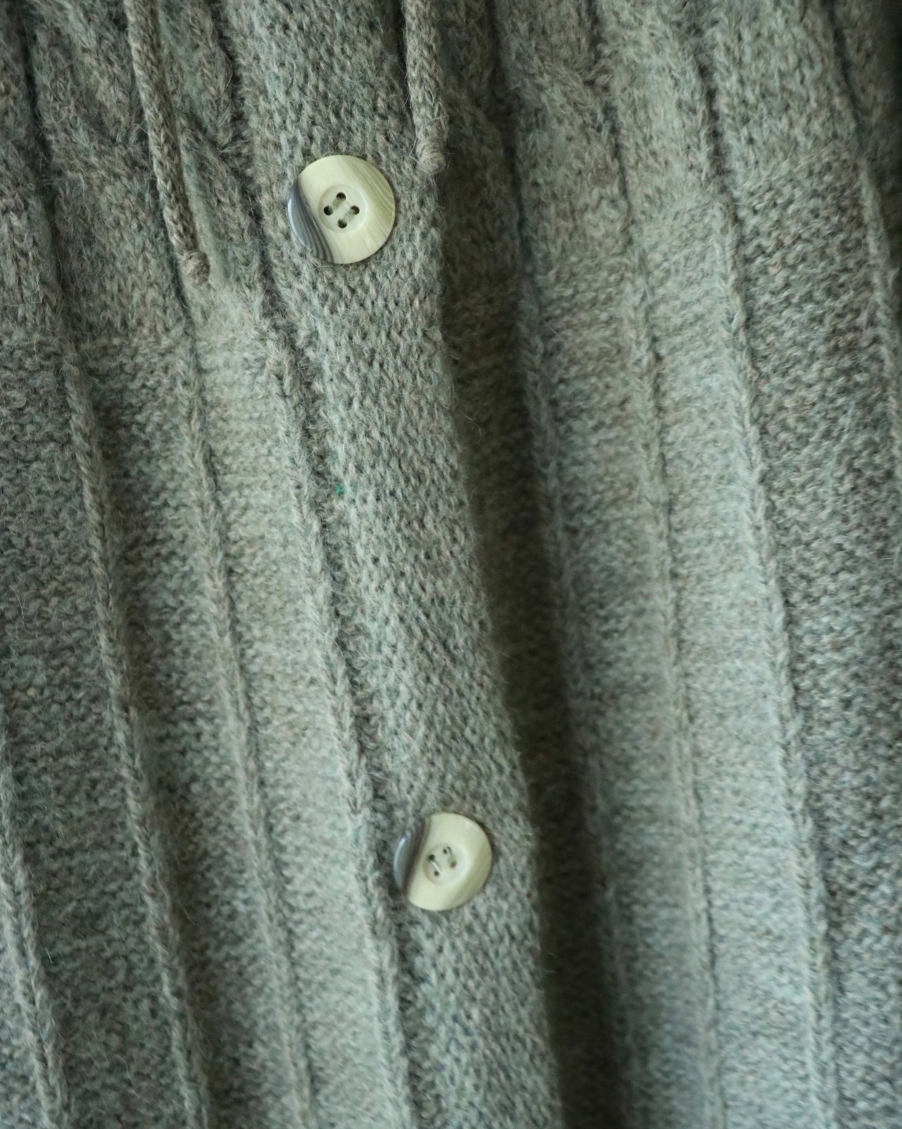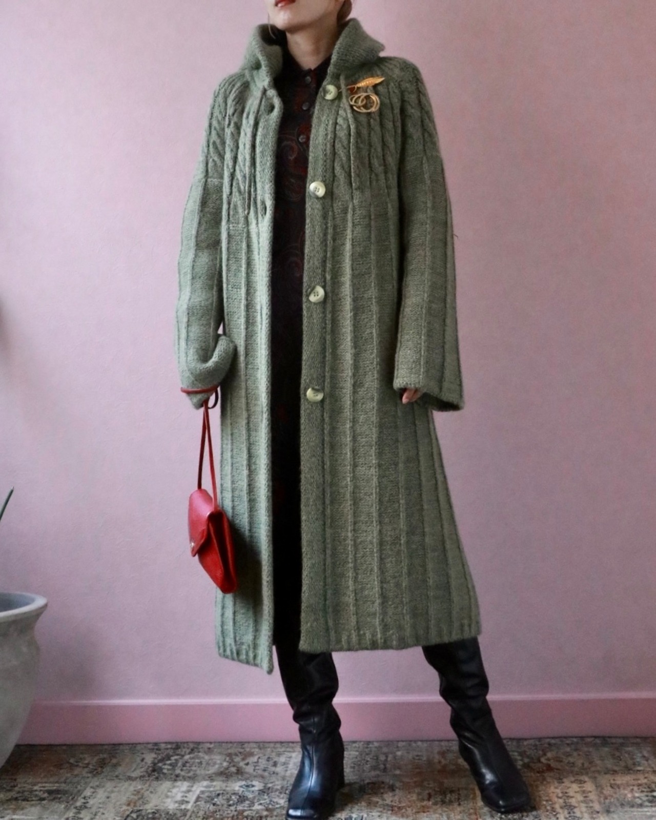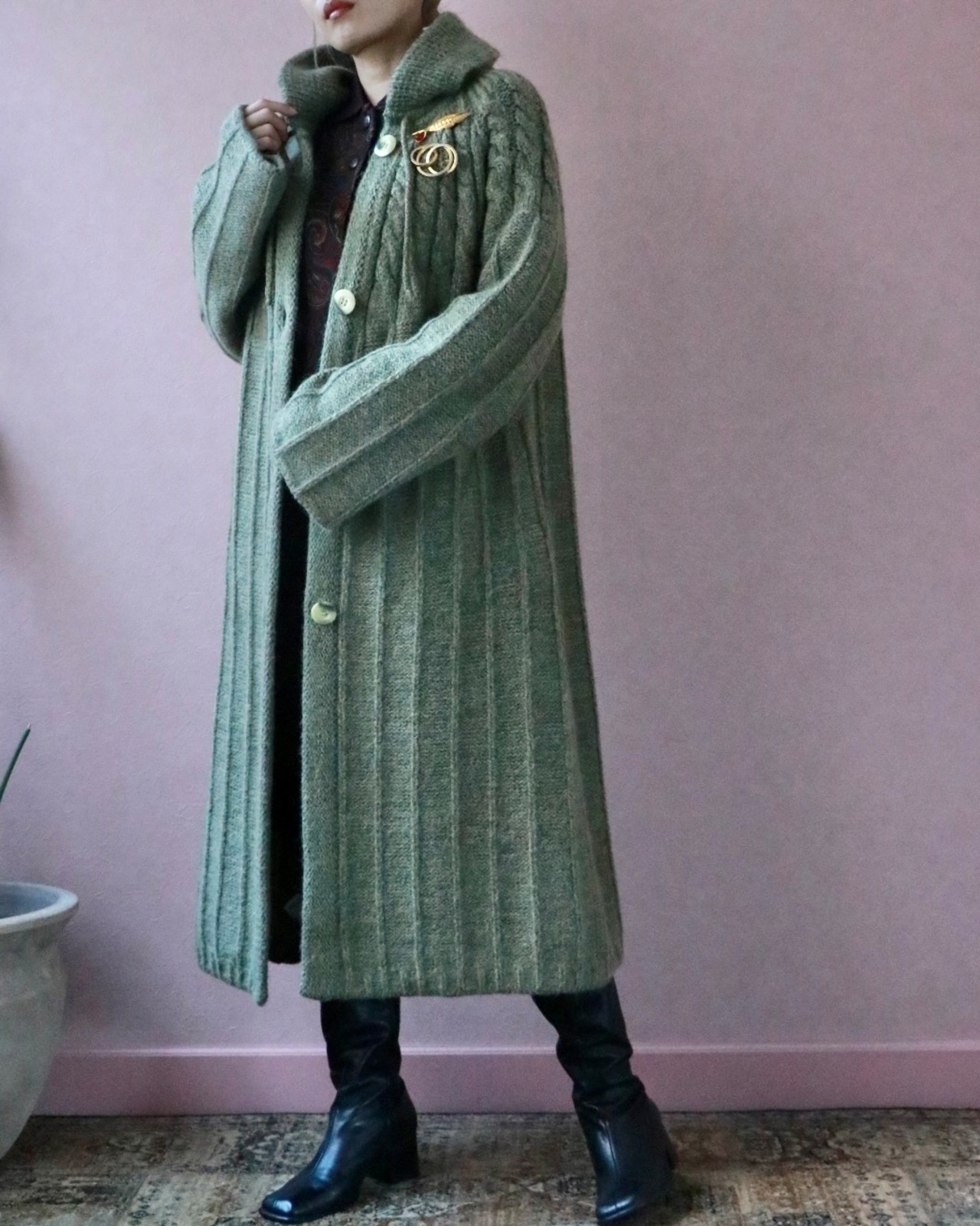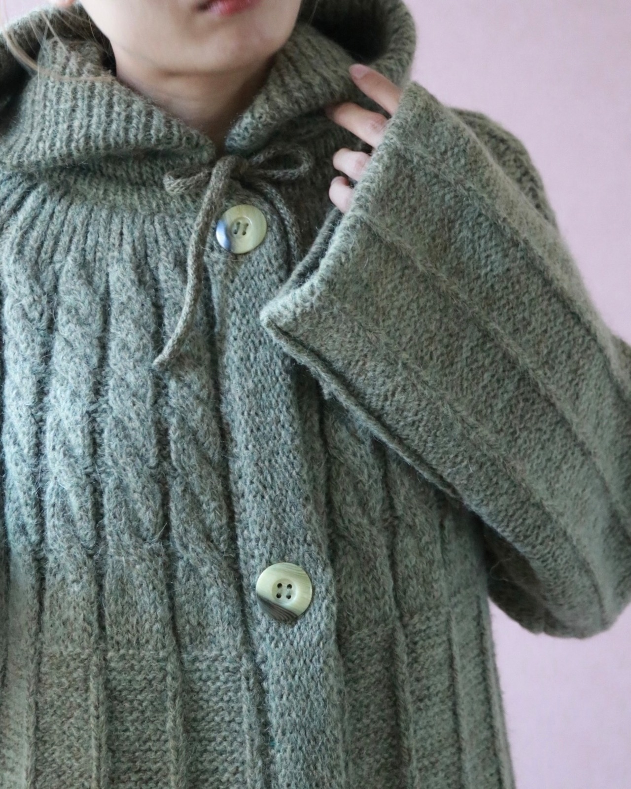 若草色や大きなボタンがどこかノスタルジックで、優しく身を包んでくれる。