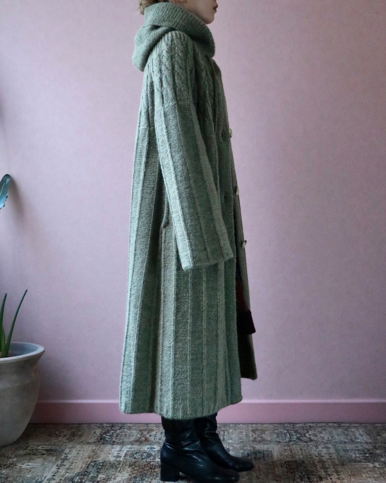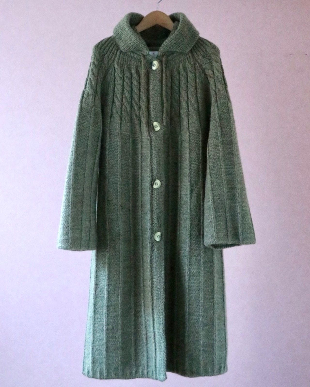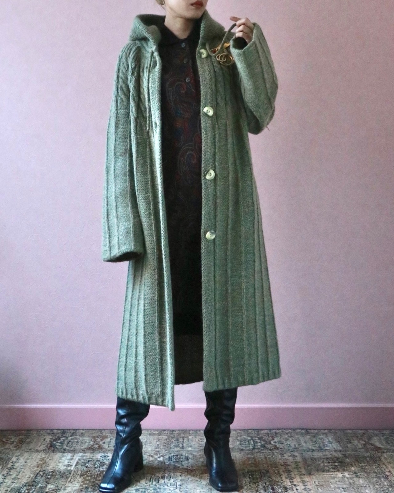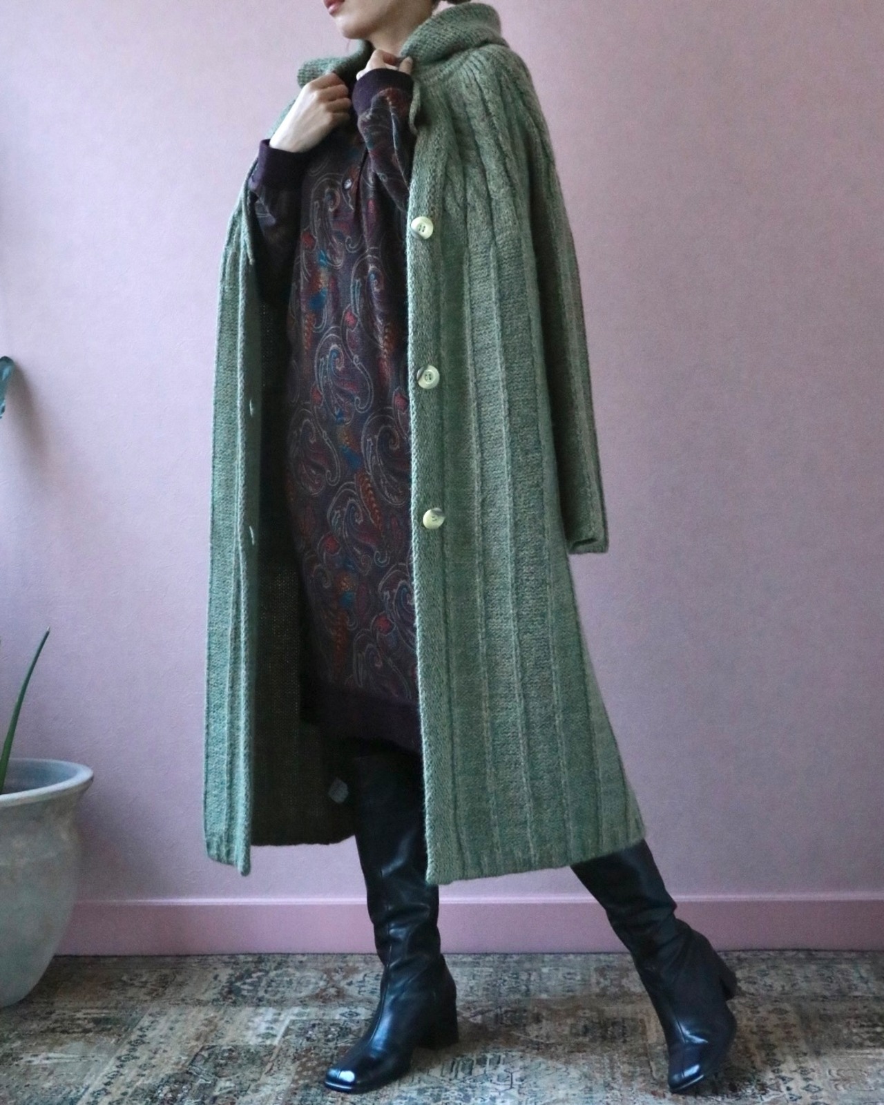 若草色や大きなボタンがどこかノスタルジックで、優しく身を包んでくれる。