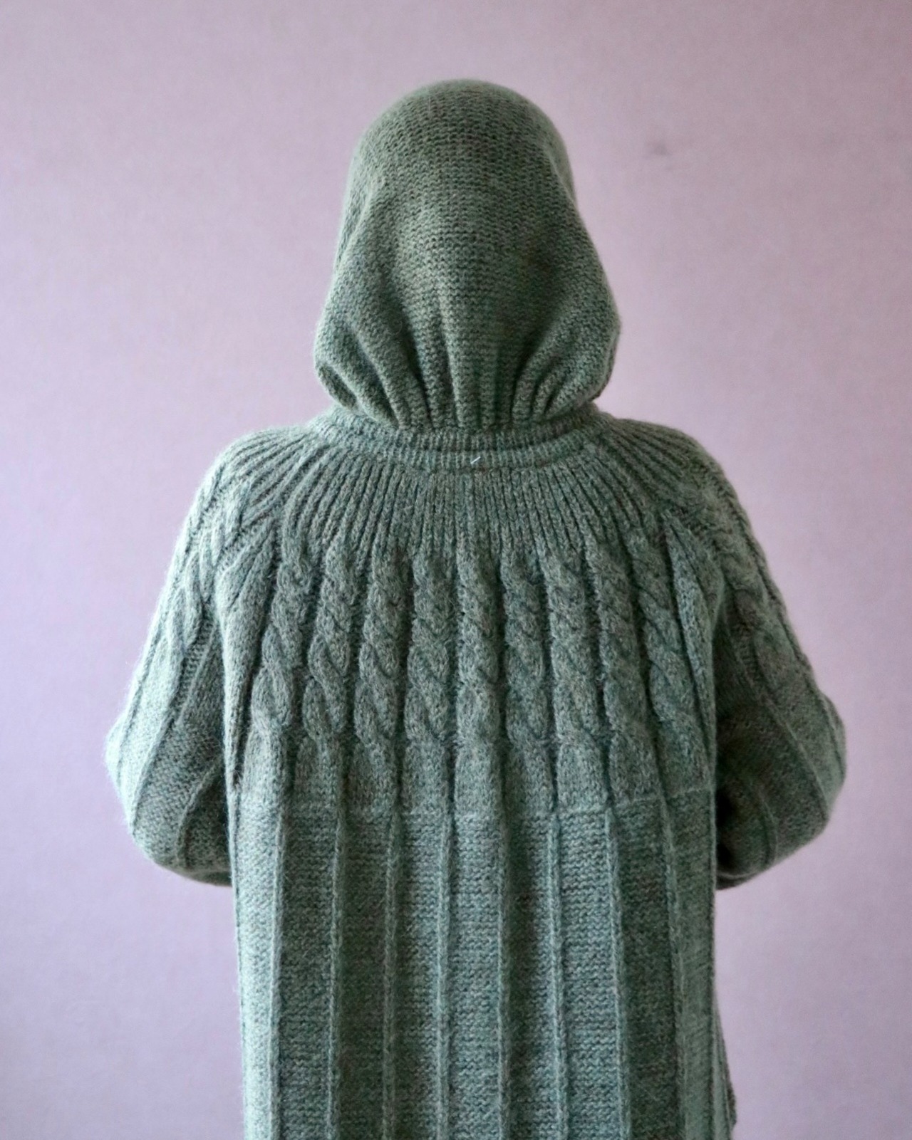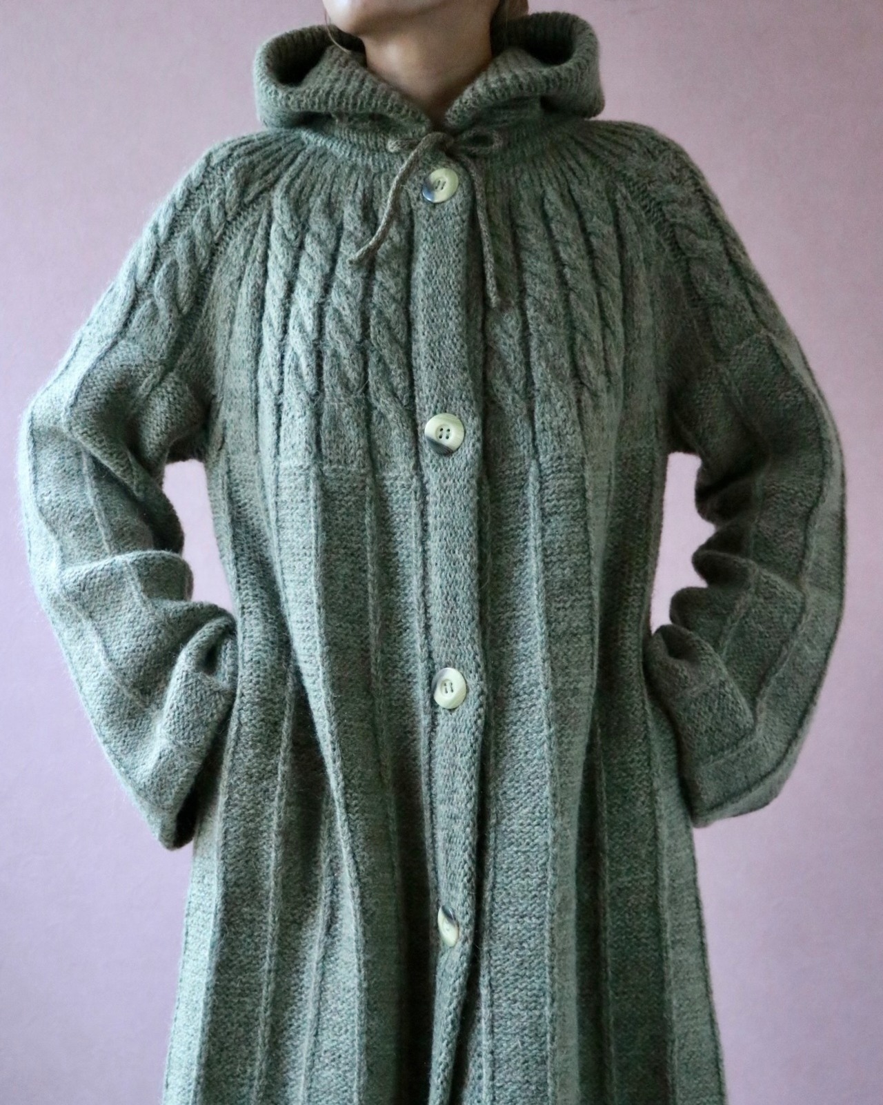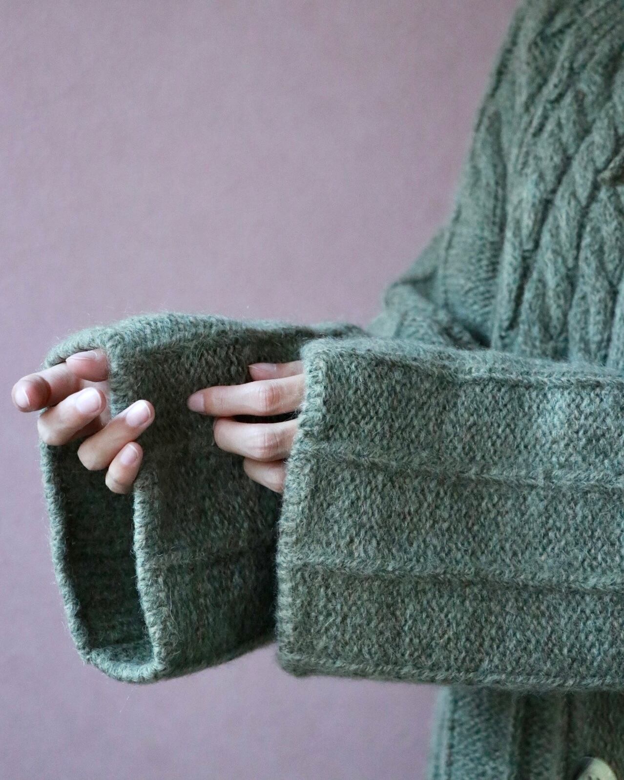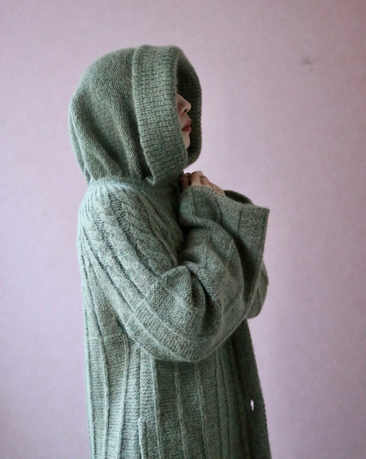 若草色や大きなボタンがどこかノスタルジックで、優しく身を包んでくれる。