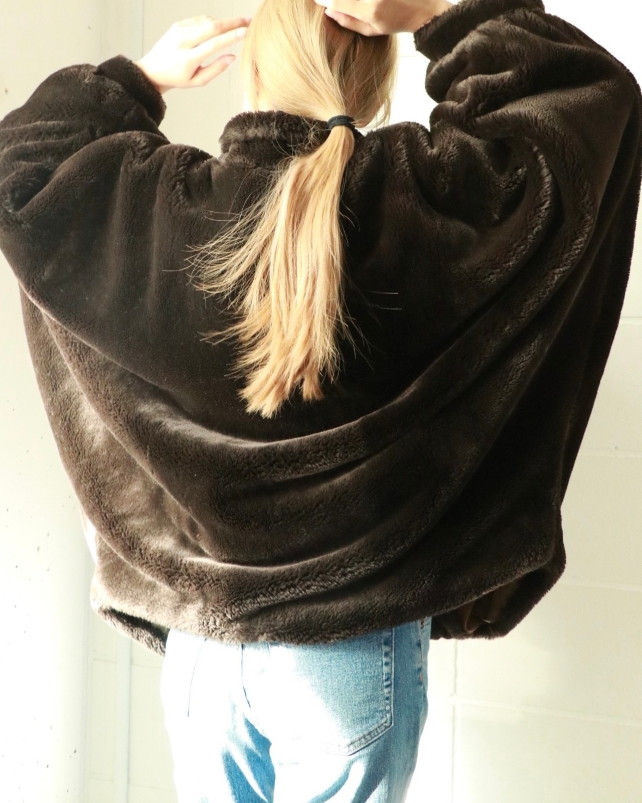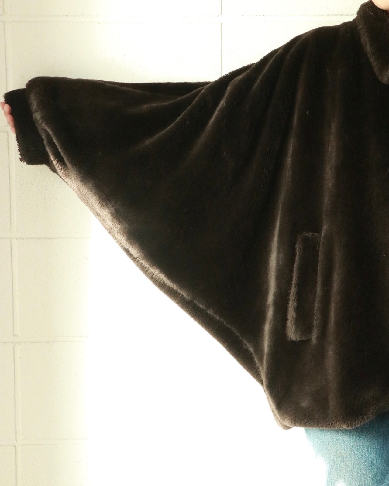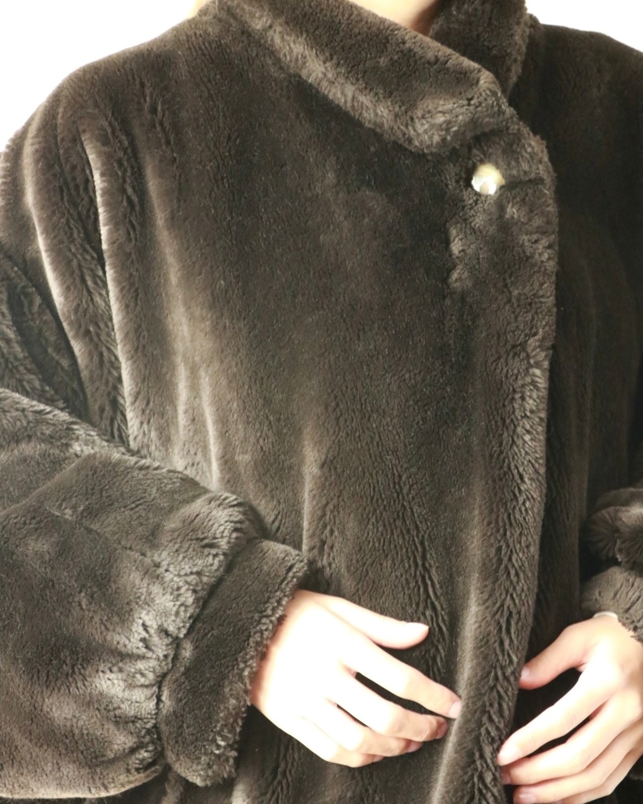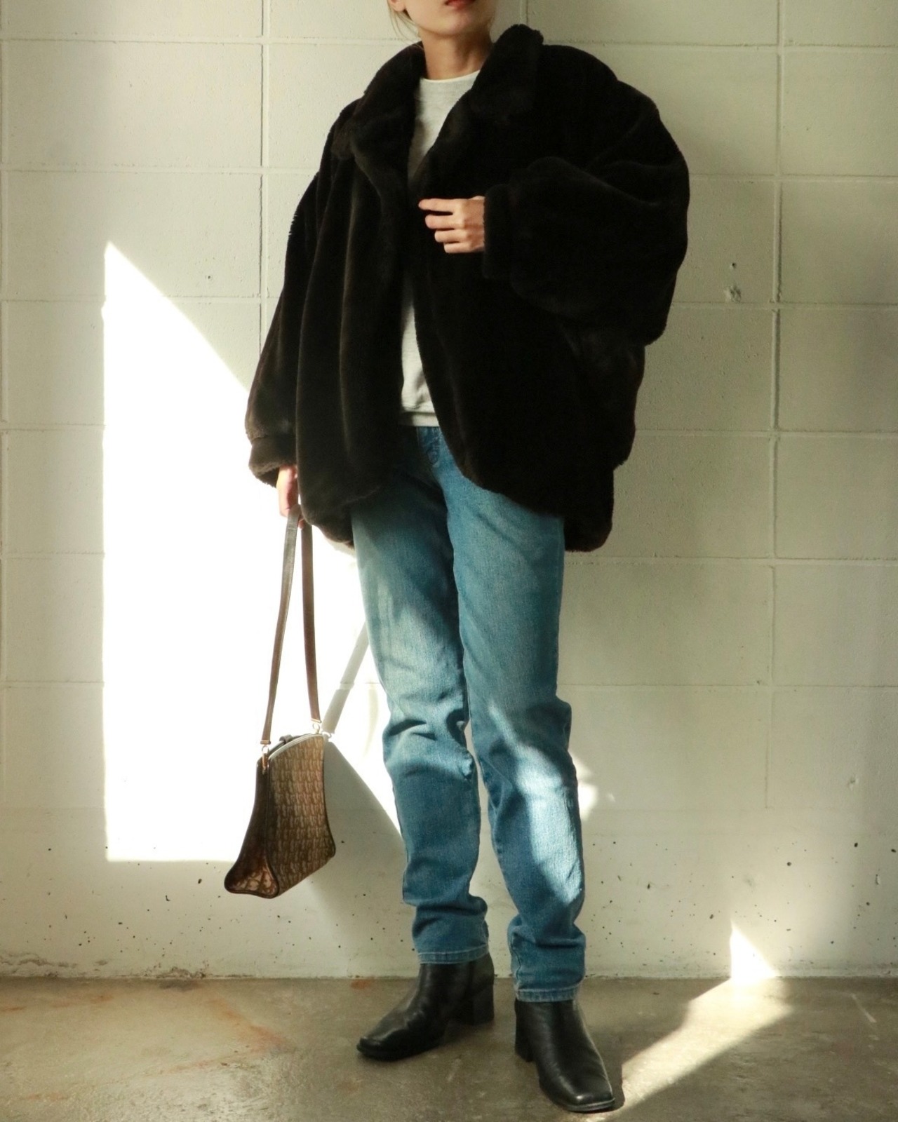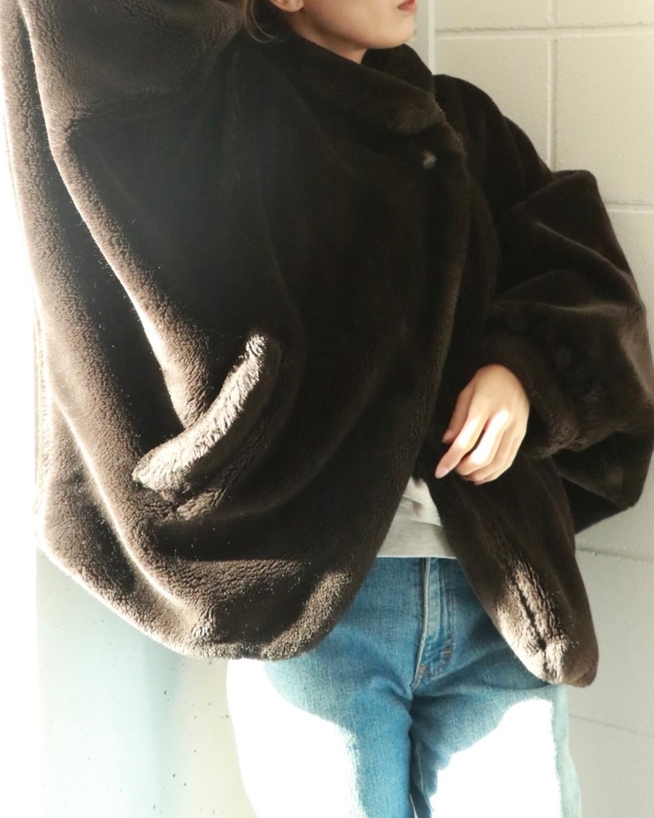 毎年人気なエコファーコートが入荷しました。エコファー特有の濃淡なダークブラウン。リアルファー顔負けの高級感漂う一着。なんと言っても独特なシルエットが特徴的。ボリューミーなシルエットにアームホールがゆったりとしているので幅広いトップスとの合わせも◎
