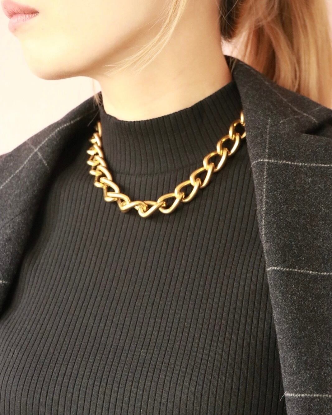 ボリューミーなチェーンネックレスはエスカーダ。華奢なネックレスもいいけれど、露出の増えるこの時期はそれだと物足りない!と感じる人も多いのでは。印象にのこる大振りネックレスはヴィンテージがおすすめです。