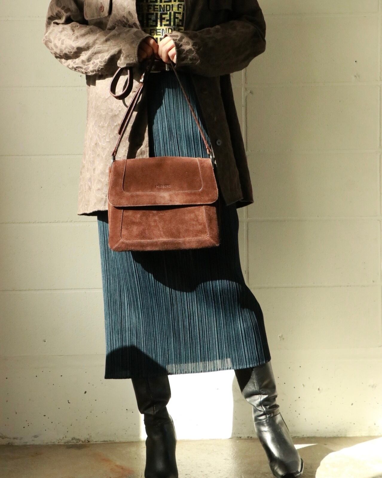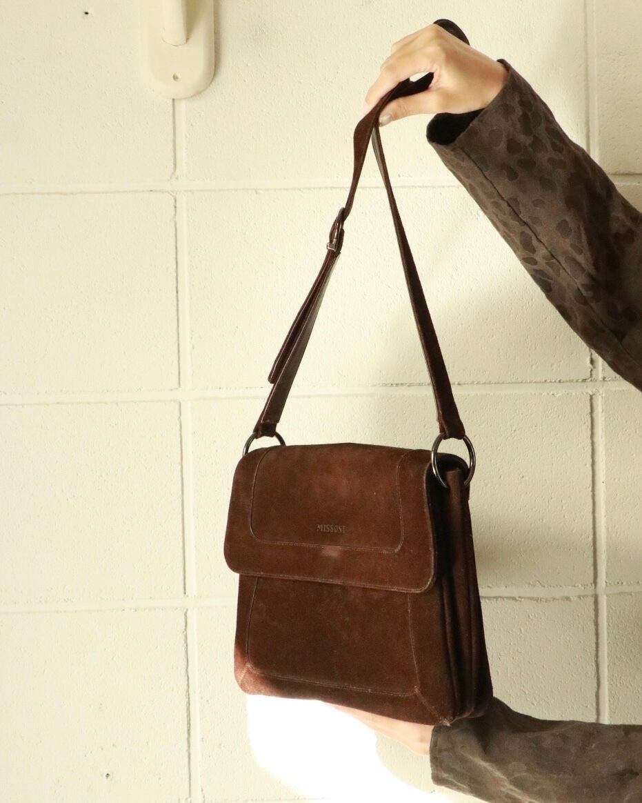 ココアブラウンのスエードレザーショルダーバッグまミッソーニのヴィンテージ。スエードの柔らかで上品な存在感にアースカラーのライナーが女性らしくどんな着こなしにもマッチします。トレンドを気にせず長く愛用できる一品です。