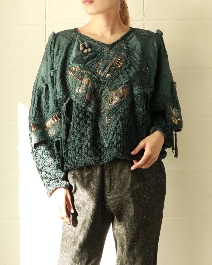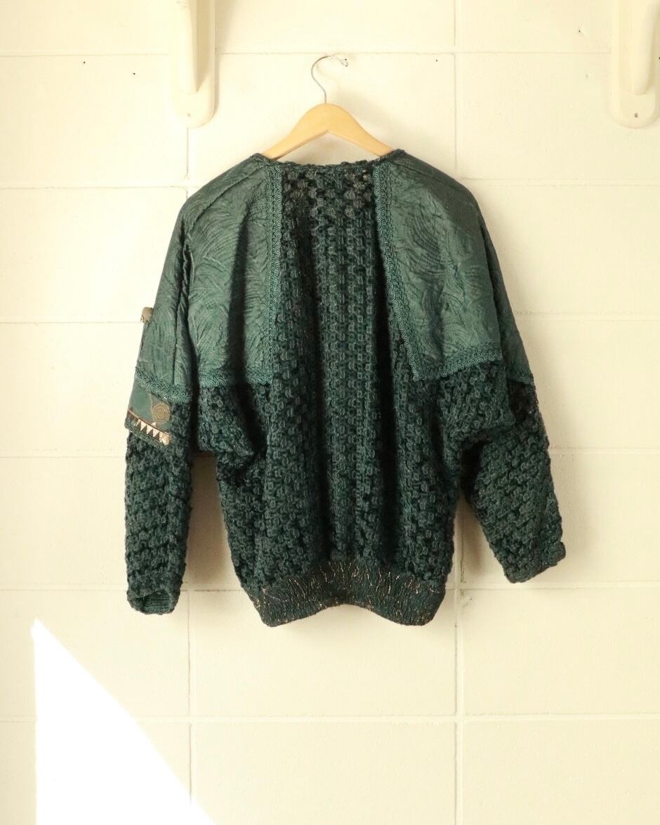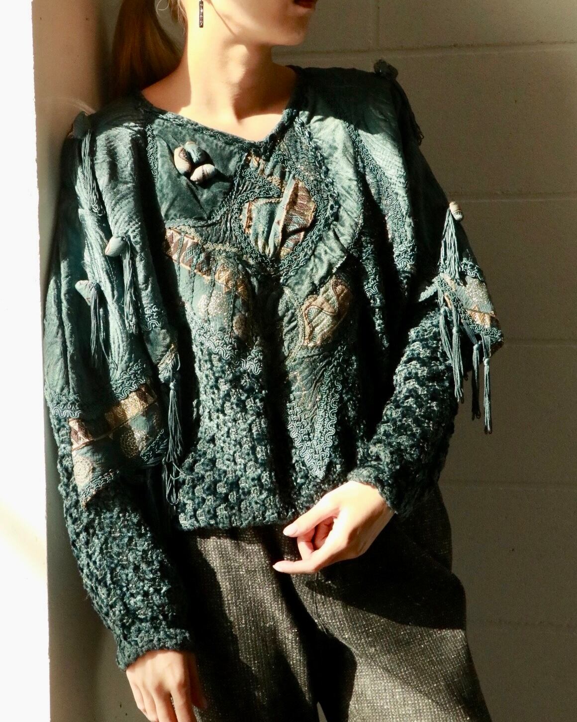 1980-1990年代、今すぐ着れるレーヨン素材のニットトップス。普段あまり見かけない深水を色ベースにベロア、レース、銀糸と異素材がデコラティブに組み合わさりコーディネートに立体感をプラス。ゆるっとしたサイズ感も◎