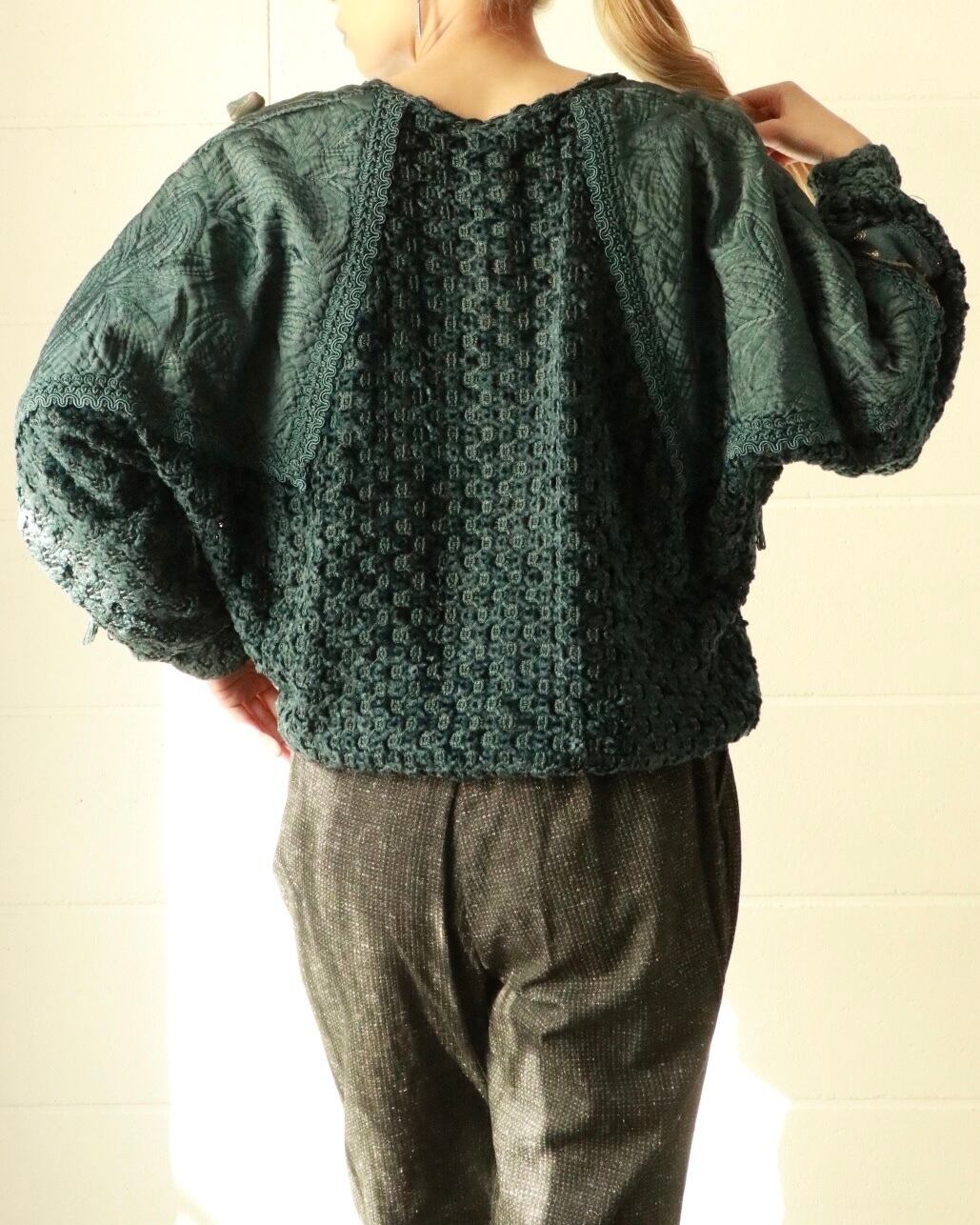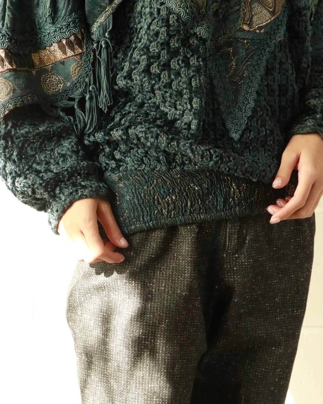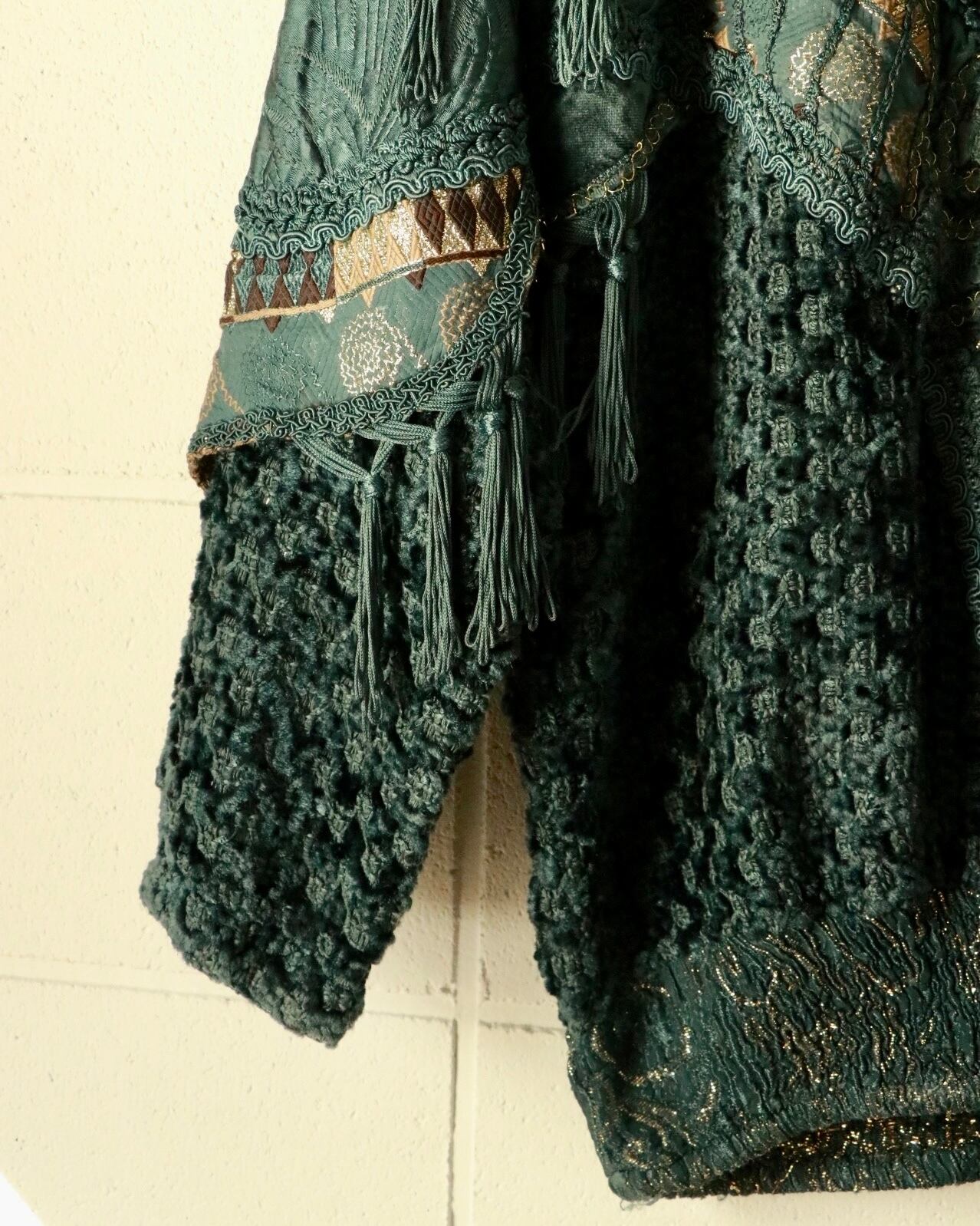 1980-1990年代、今すぐ着れるレーヨン素材のニットトップス。普段あまり見かけない深水を色ベースにベロア、レース、銀糸と異素材がデコラティブに組み合わさりコーディネートに立体感をプラス。ゆるっとしたサイズ感も◎