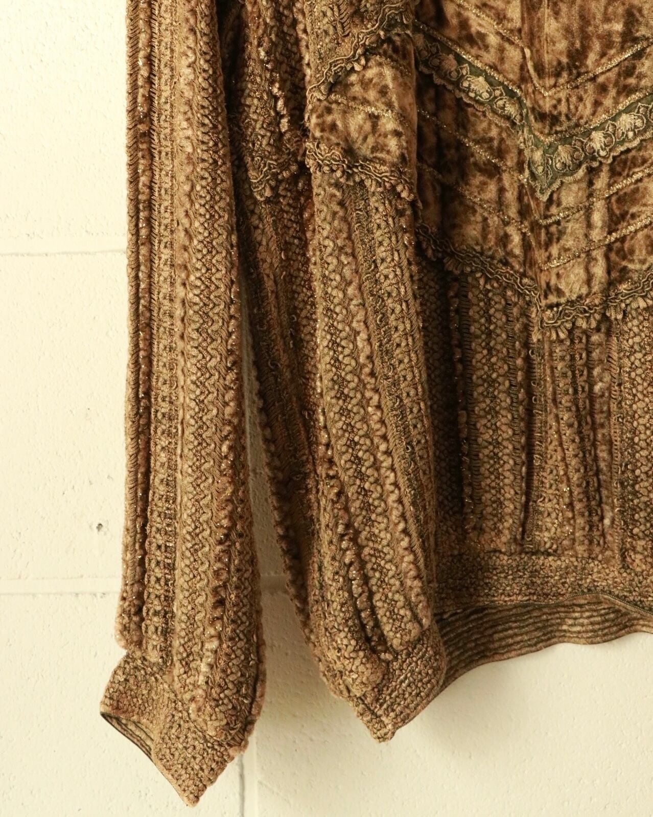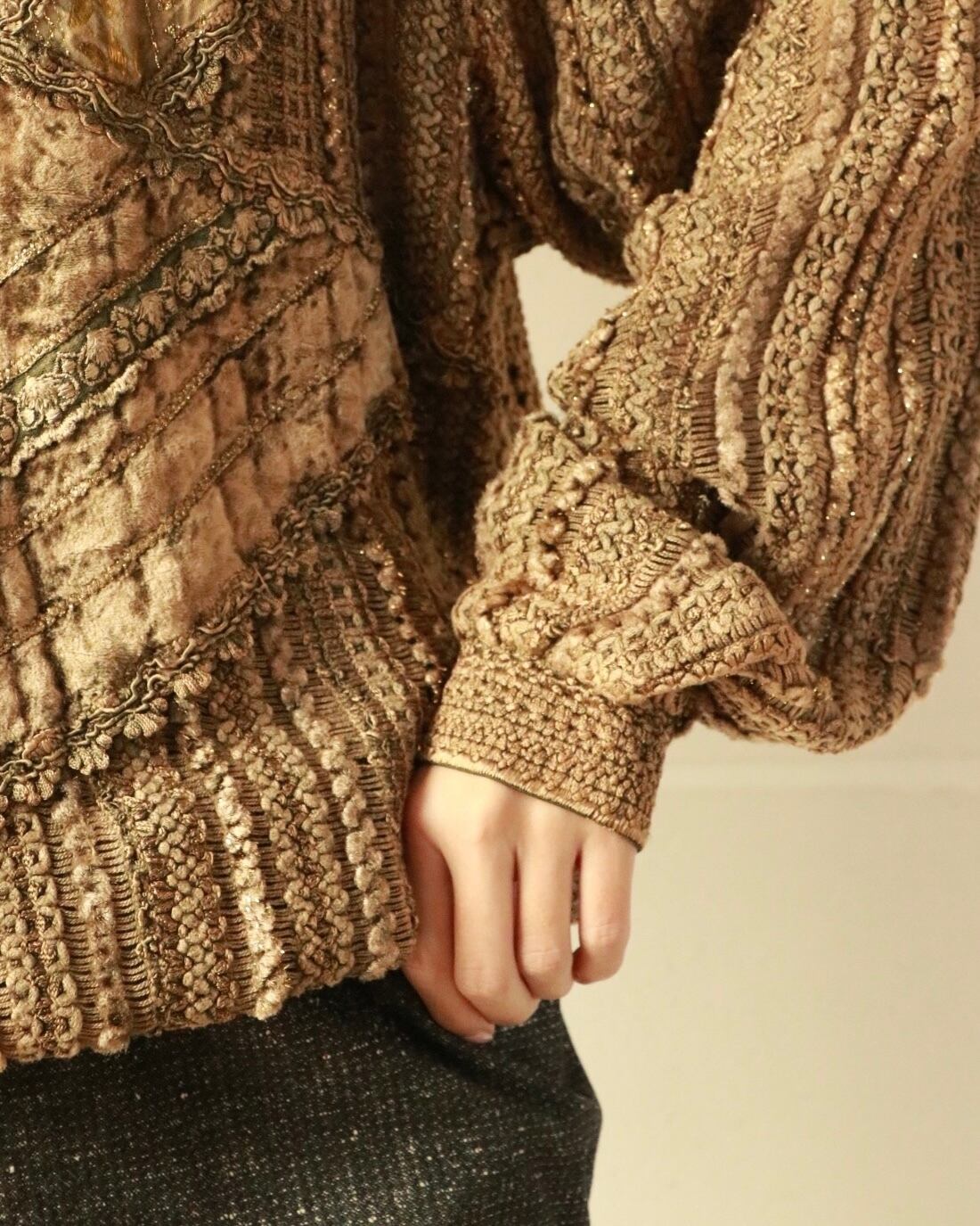 落ち着きのあるゴールド一色の中でベロアにレース、金糸と異素材がデコラティブに組み合わさりコーディネートに立体感を。ゆるっとしたサイズ感も◎