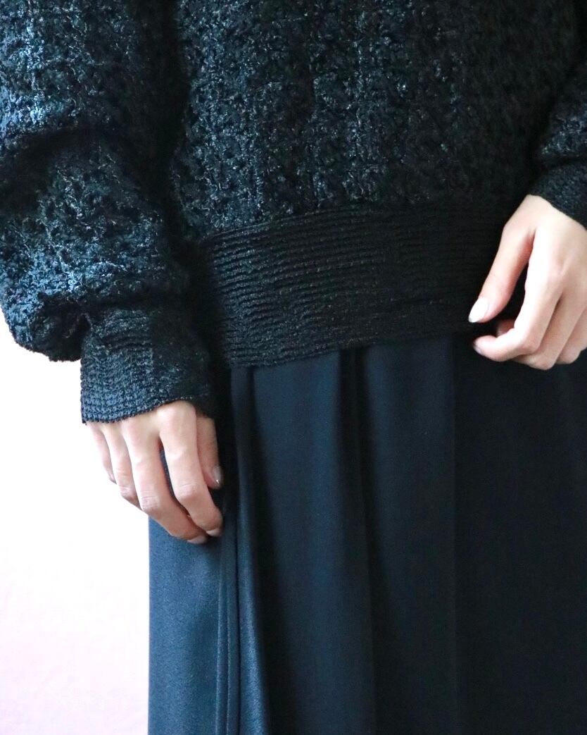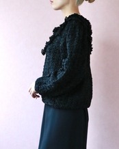1980代の今すぐ着れるレーヨン素材のニットトップス。ブラックをベースフリルなどの装飾で立体感をプラス。ゆるっとしたサイズ感も◎柄やカラーのボトムスや異素材アイテムとも相性良し。