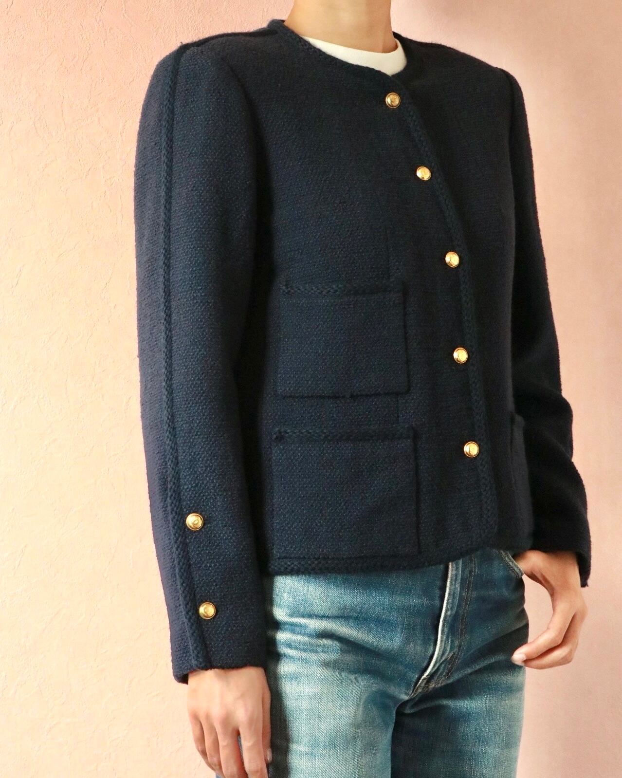 うっとりするシルエットの美しさ、気品溢れるネイビーカラーにロープデザインが施され、控えめなゴールドココボタンとデイリーにもオケージョンにも使えるスペシャルなツイードジャケット。サイズ感も良く、ここまで美品の70sシャネルは中々入荷しないので気になるかたは是非。