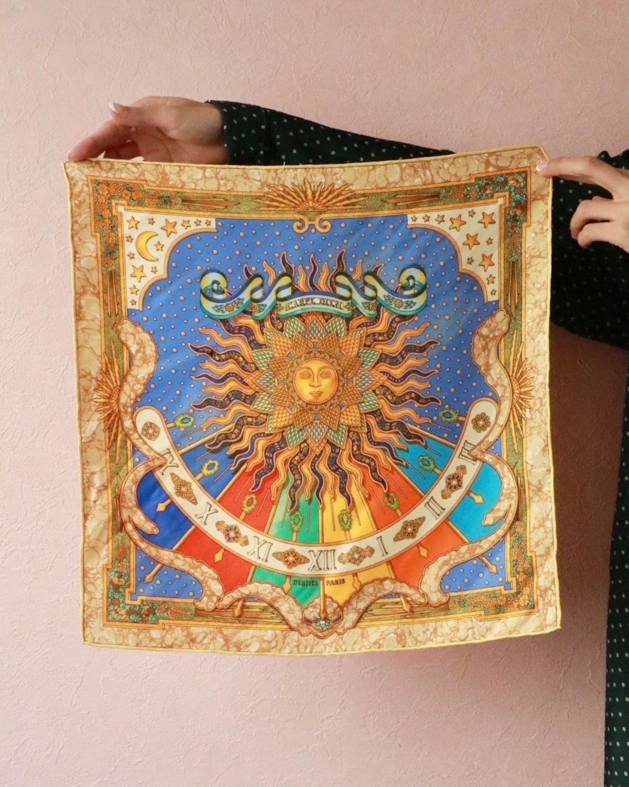 上質なシルク素材や絵柄が素敵なヴィンテージスカーフは、ついつい集めたくなってしまいます。ミニマルなサイズ感が今ムードにフィット。こちらのエルメスはイェロー+ブルーをベースに太陽の絵柄が鎮座するデザインは圧巻です。気分で巻き方、巻く場所を変えて日々に変化をつける楽しさを味わってみてはいかがでしょうか。