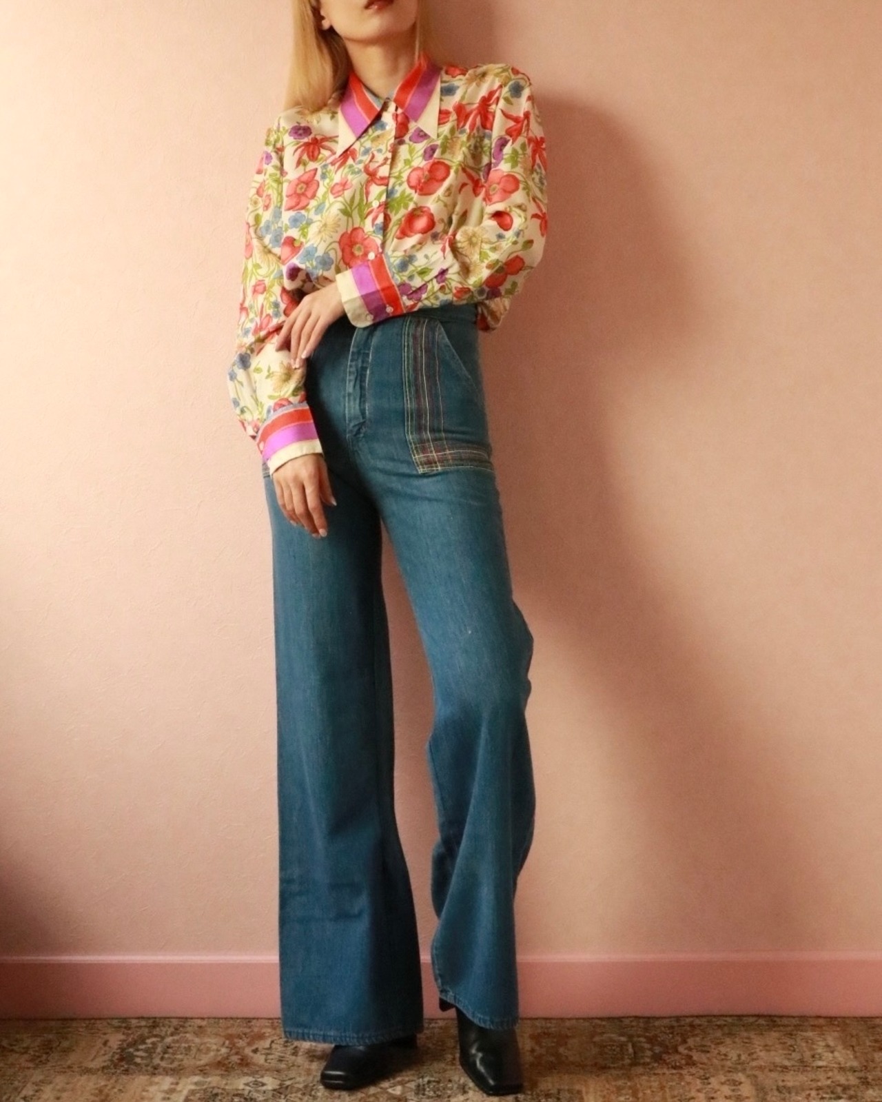ヴィンテージにしかない絶妙なフレア加減となっており70'sらしいバックデザインのステッチもポイント。長めのトップスで合わせフレアを生かしたコーディネートもおすすめです。