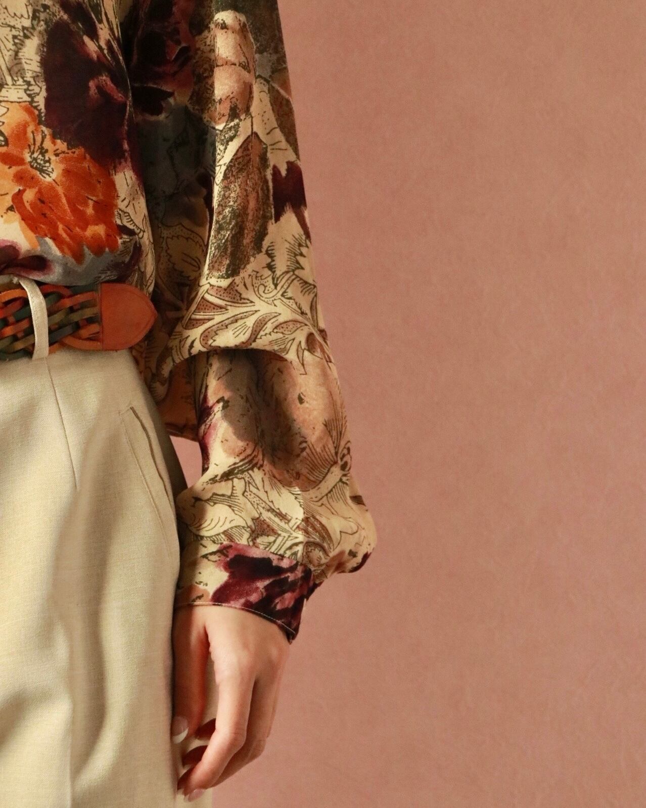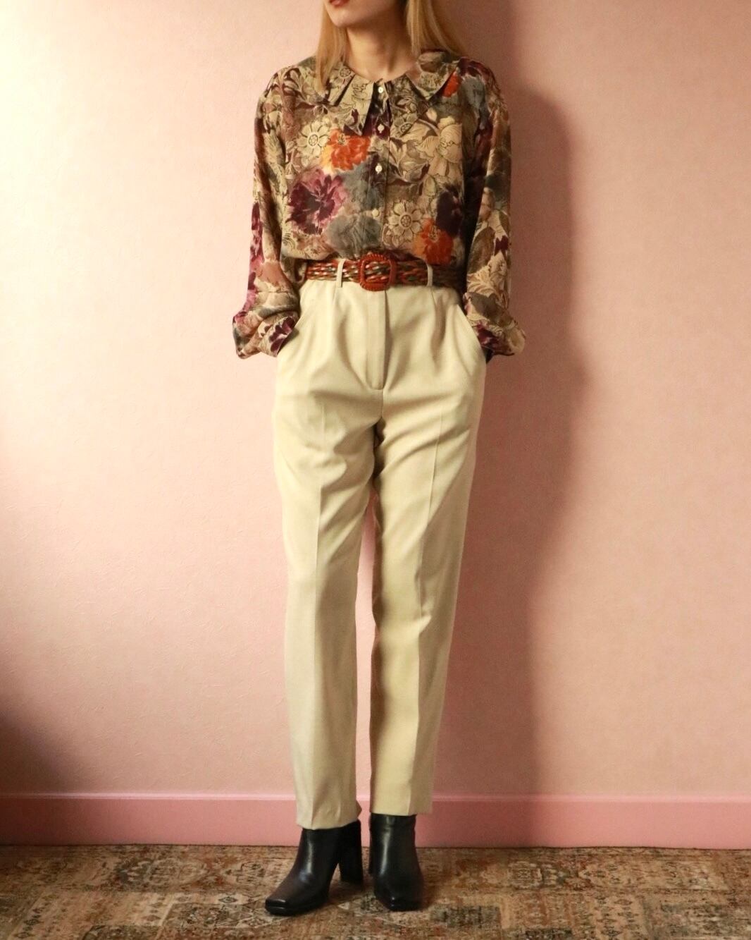 花柄ですが、ベージュベースで適度に落ち着き、フェミニンになりすぎることなく、大人女性でも着られる。