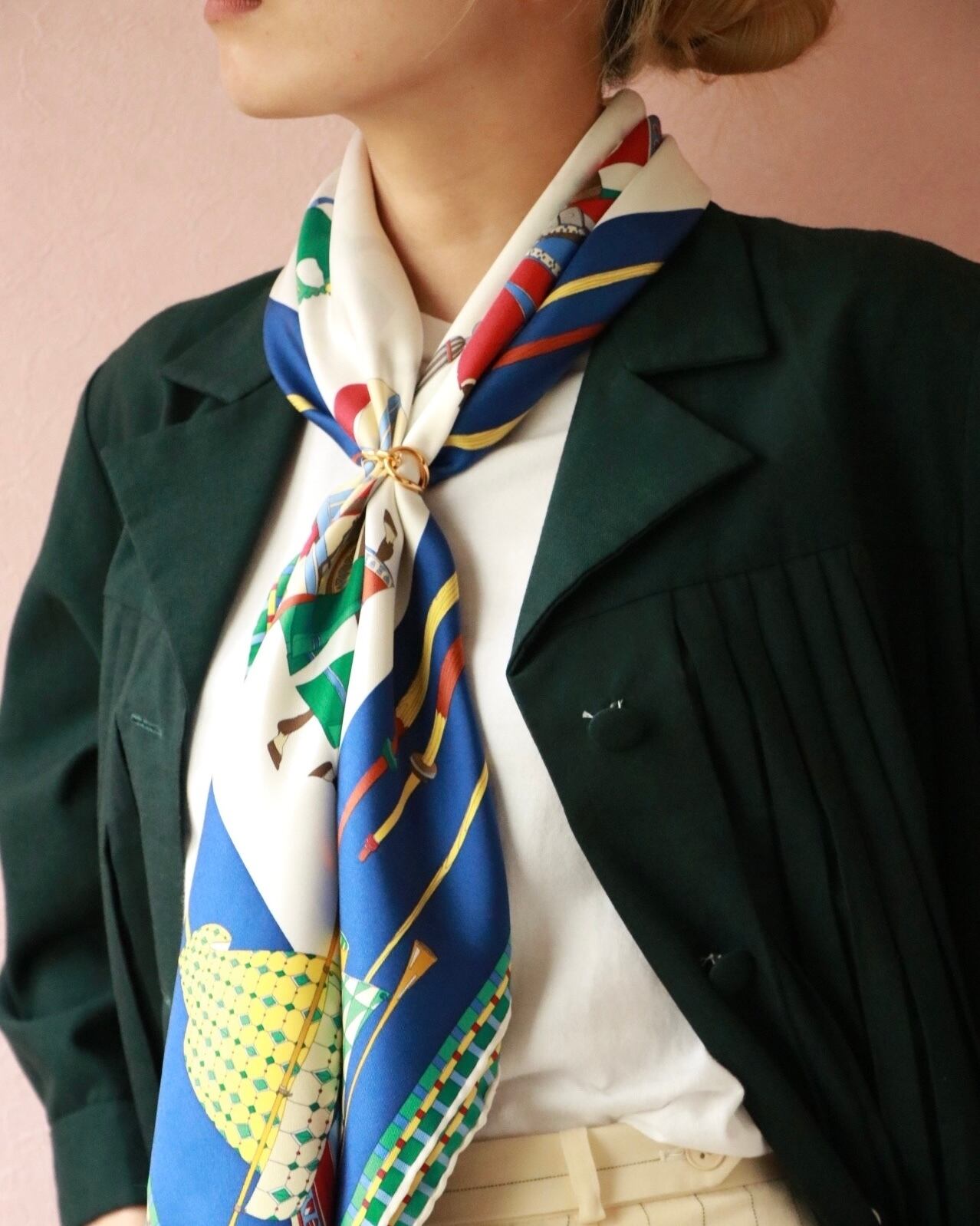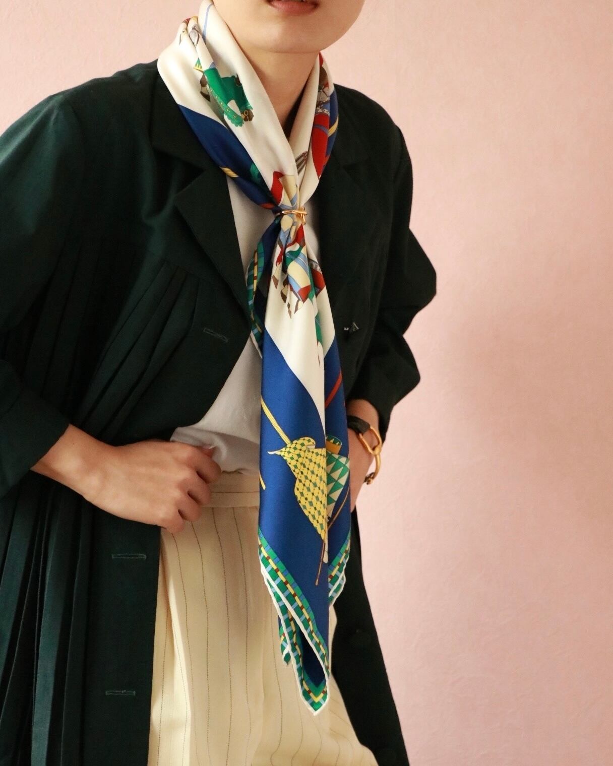 春夏に大活躍する爽やかな色合いの大判スカーフはグッチのもの。