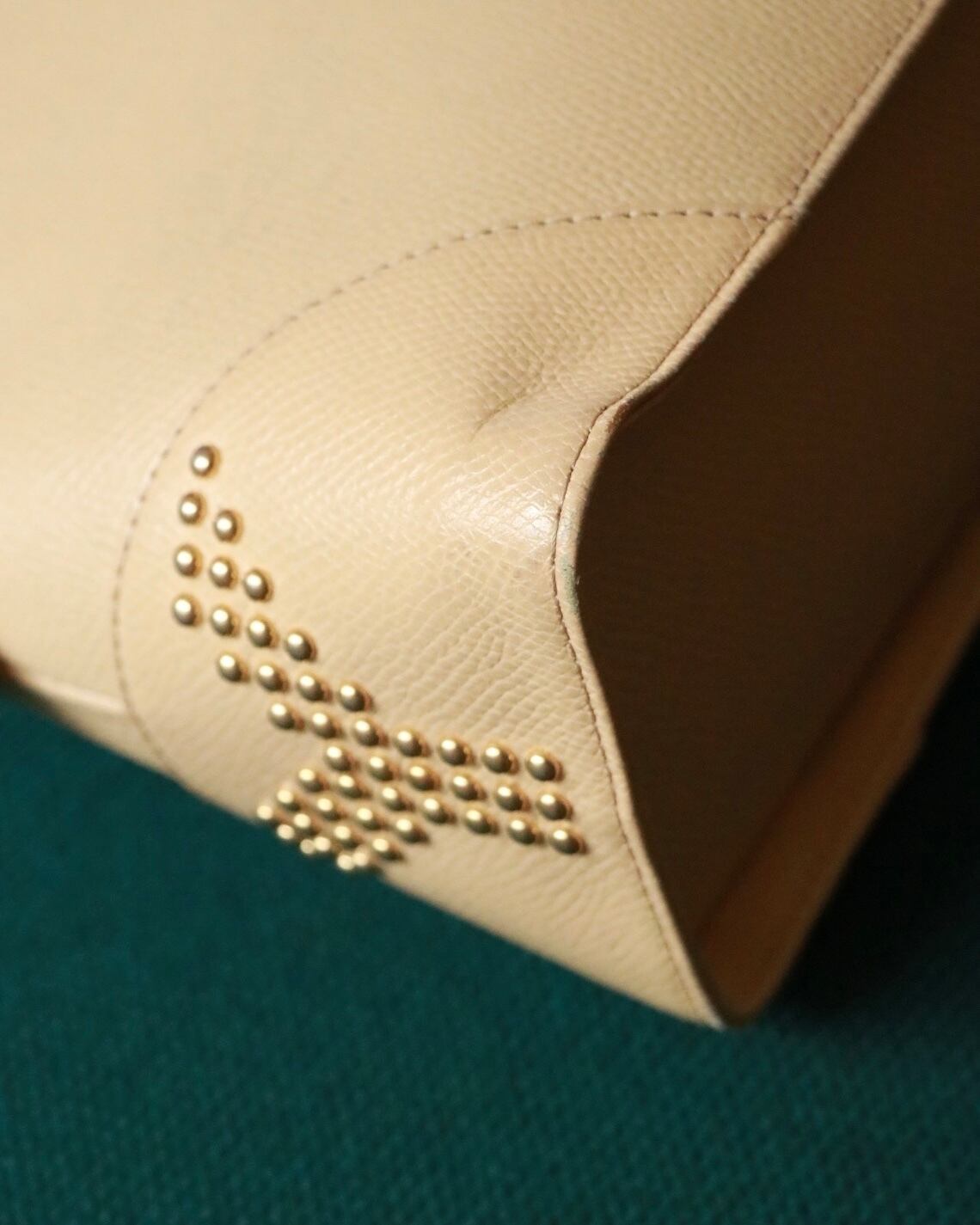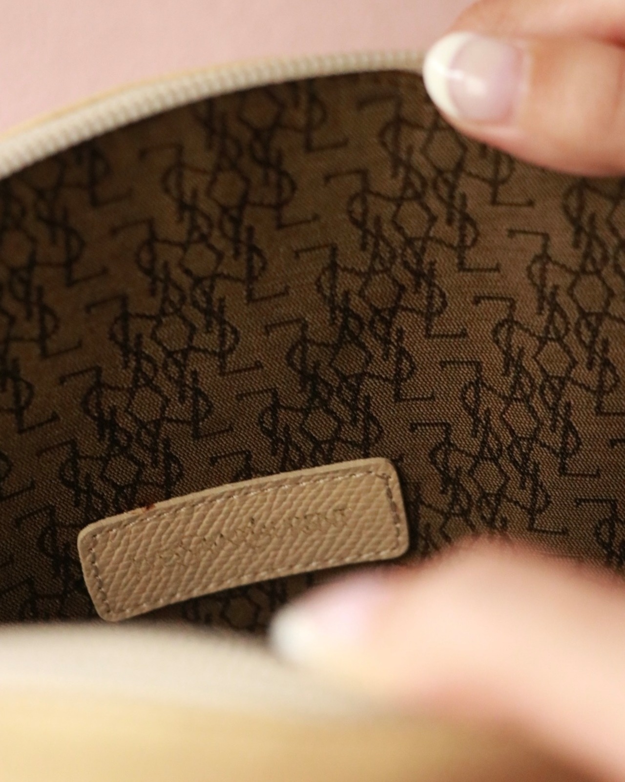 サイドに付いたYマークのゴールドスタッズがエッジを利かせたデザインで、クラシックスタイルはもちろんカジュアルスタイルとも相性抜群◎ 収納力のある優秀なサイズの上に、2wayになった持ち手はハンドバッグとしても、斜めがけやショルダーにもかけられます。またファスナータイプで安心感があり、オフィスや小旅行などにも使え、永年使いたいバッグです。内側のYSLモノグラムもとっても可愛いポイント。