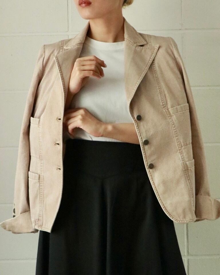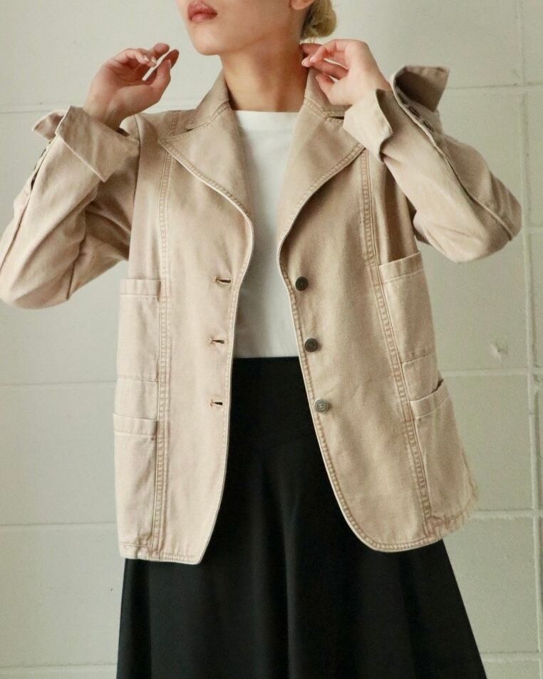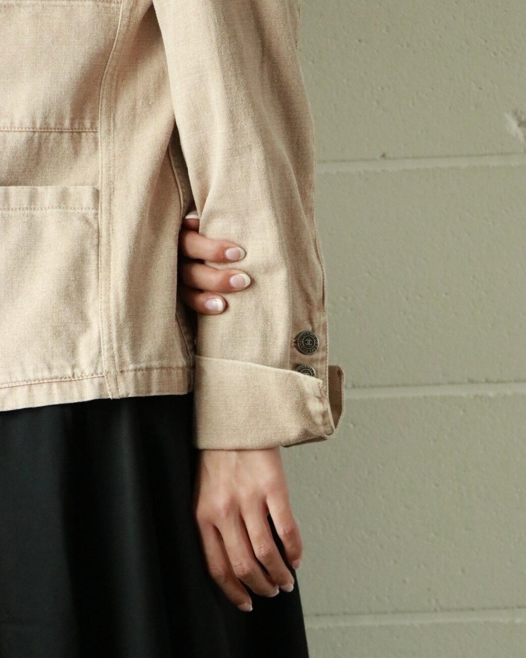 ピンクベージュが春めくこちらのデニムジャケットは、CHANELのもの。