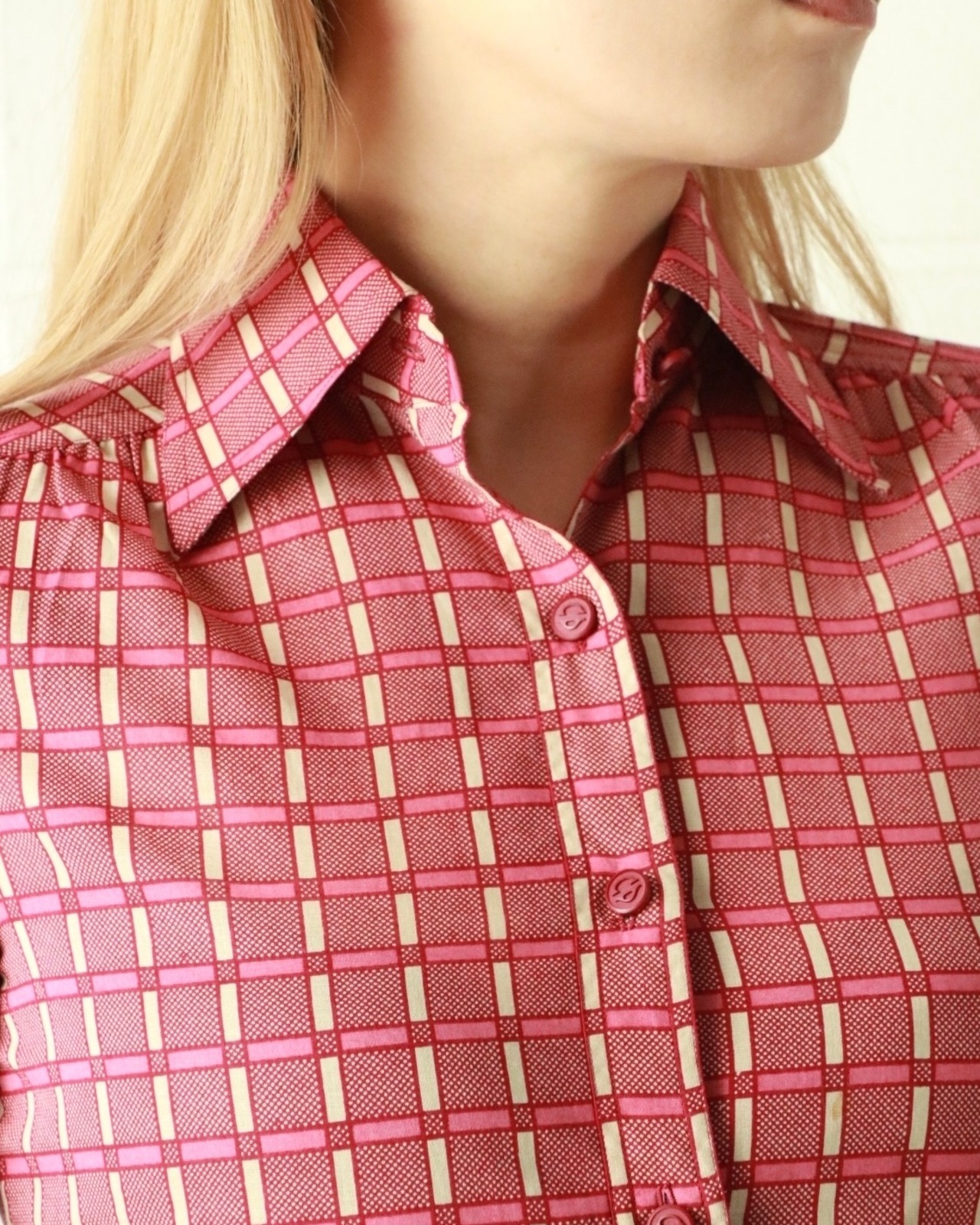 シンプルな形ながら遊び心のある配色で、春先は一枚で、寒いときは重ね着して襟だけ出してもアクセントになるシャツです。