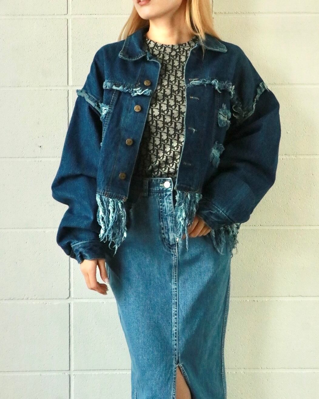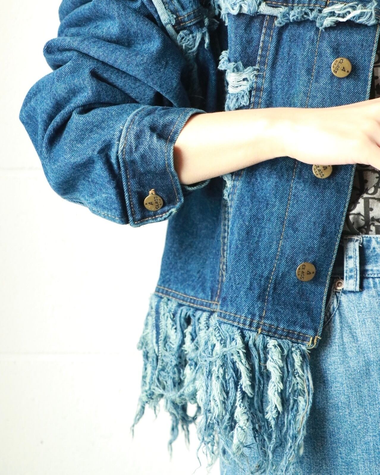 全体的にフリンジがたくさんついたヴィンテージ デニムジャケット。コットンのしっかりとした素材感のシュート丈のゆったりボディー。Tシャツやブラウスにサクッと羽織れるオーバーサイズ感が今の気分にハマる。