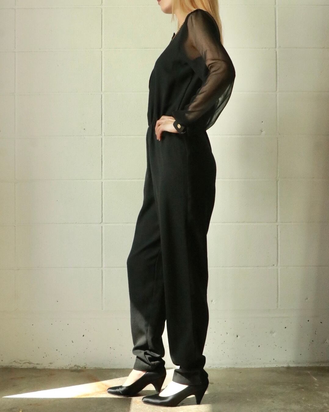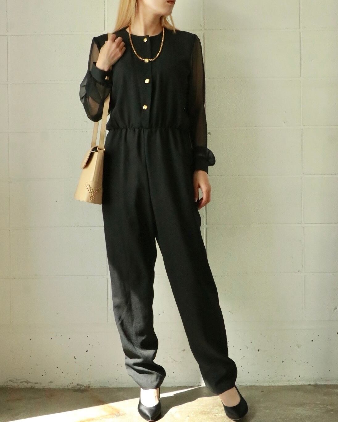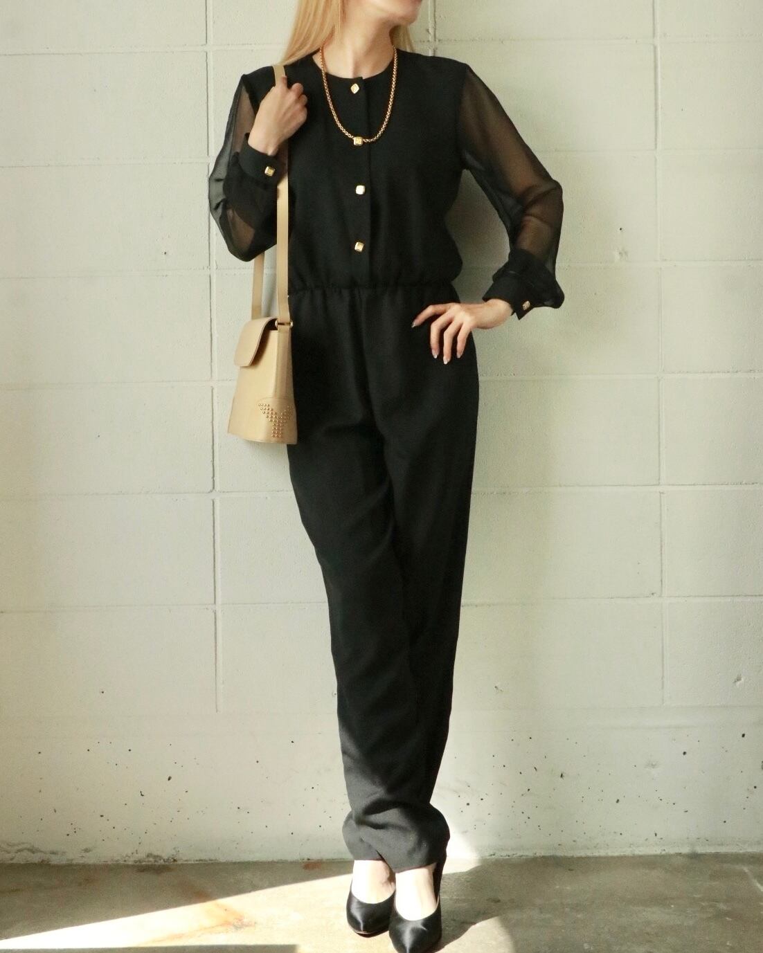 ヴィンテージ好きなら一枚はワードローブに揃えたいブラックオールインワン。難易度が高いイメージのオールインワンですが、こちらはモードな印象のオールブラックで綺麗に決まります。シースルースリーブでオケージョンにもぴったりな一着です。