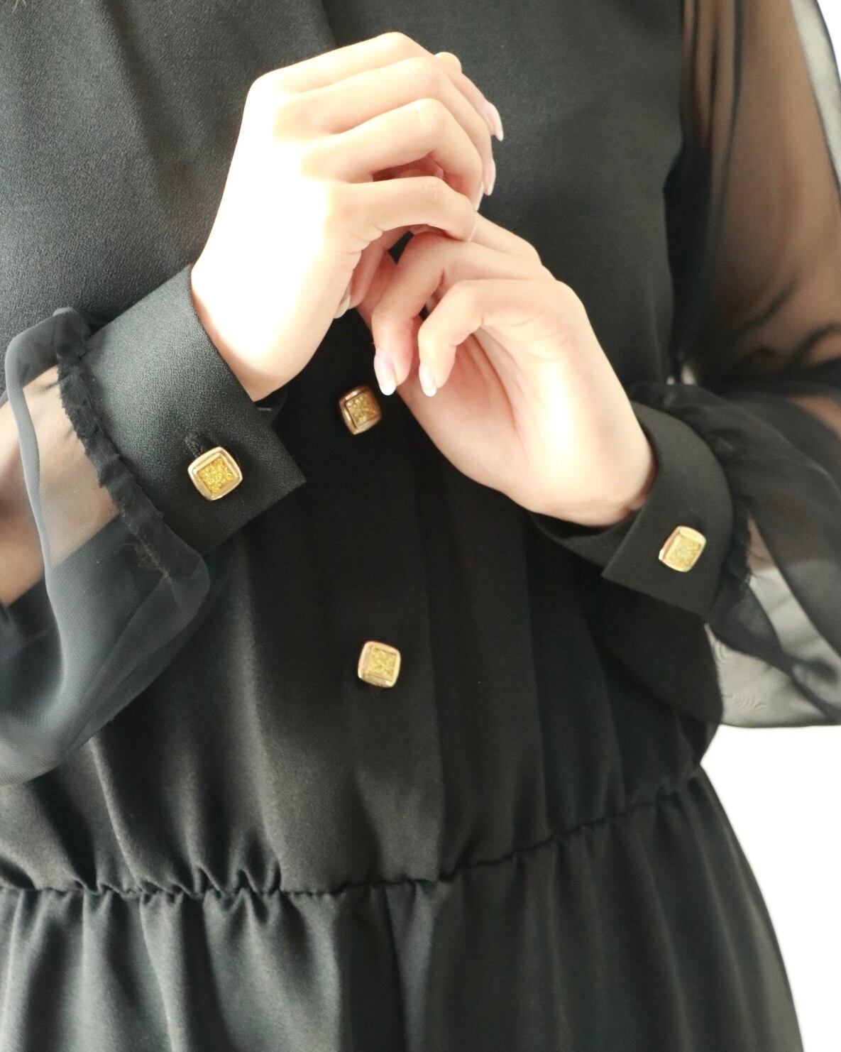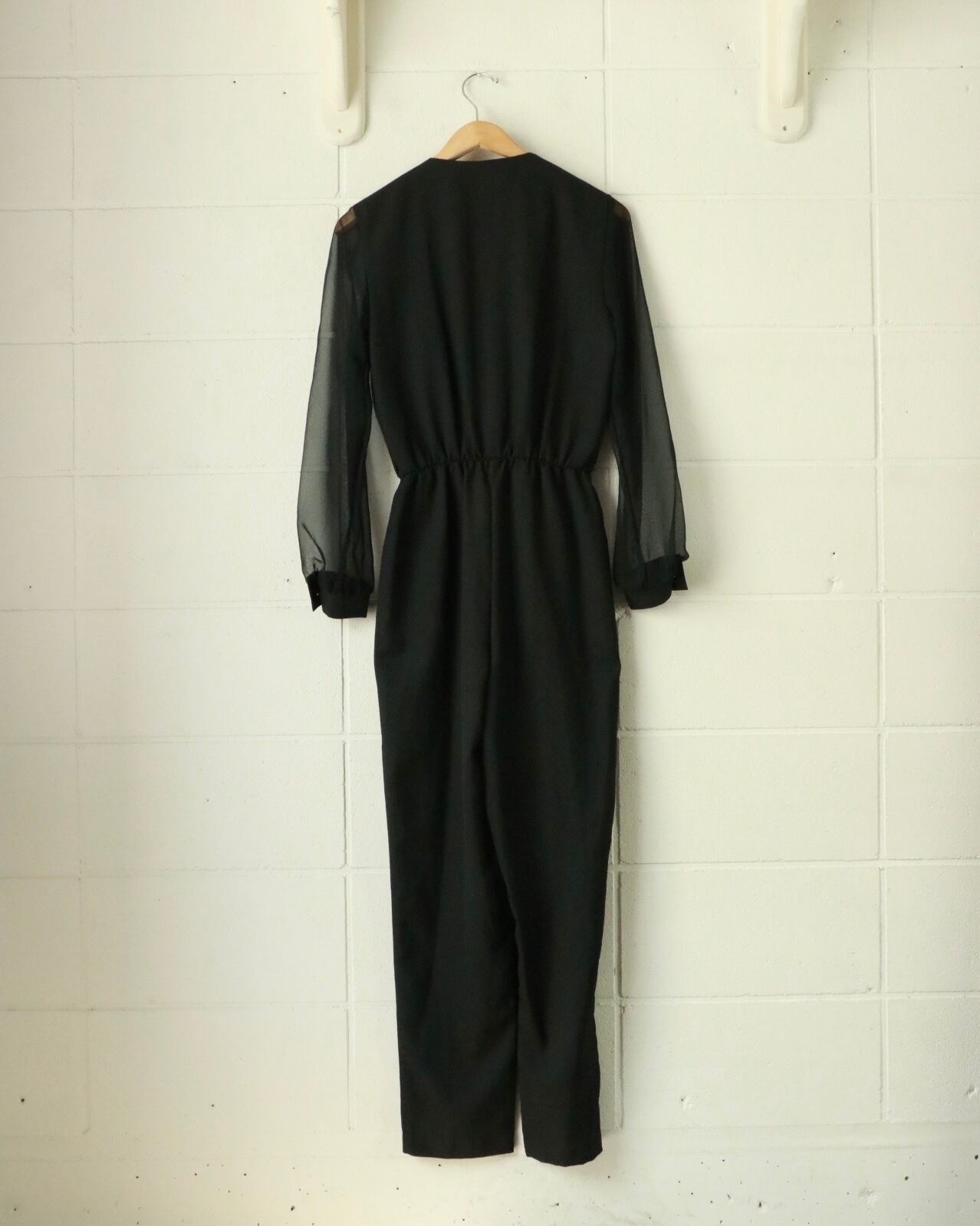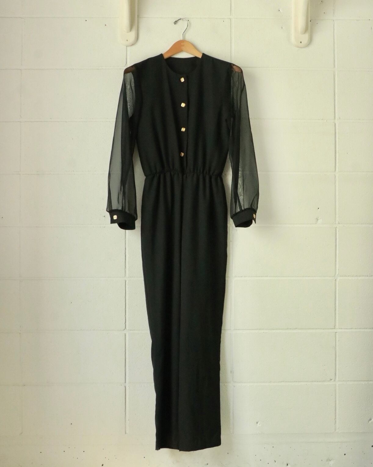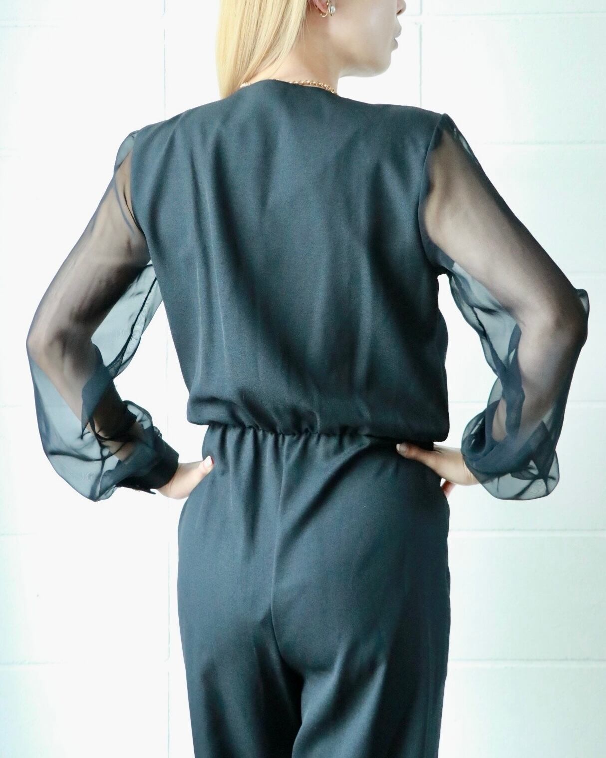 ヴィンテージ好きなら一枚はワードローブに揃えたいブラックオールインワン。難易度が高いイメージのオールインワンですが、こちらはモードな印象のオールブラックで綺麗に決まります。シースルースリーブでオケージョンにもぴったりな一着です。